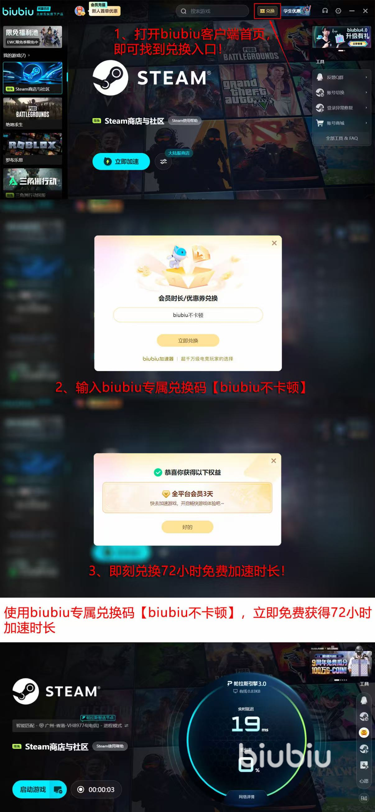 现在加入还能获得无门槛体验资格,注册新用户立享24H免费加速,所有用户在输入口令【biubiu不卡顿】以后还能额外获得3天免费加速。对于新用户来说,两项福利叠加共享受96H的免费体验,足够大家在周末或者假期一口气玩个过瘾了。