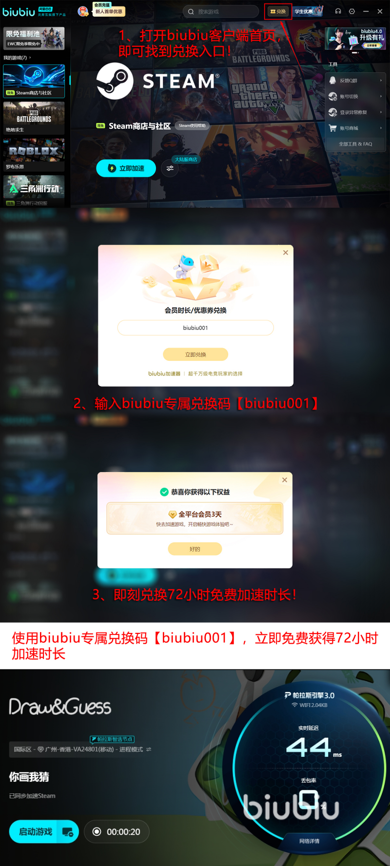 针对联机场景下的闪退,网络质量仍是决定性变量。biubiu加速器依托九游、交易猫、biubiu加速器三大产品同属阿里巴巴灵犀互娱旗下技术体系,集成帕拉斯3.0引擎,在低延迟与高连通率方面具备工程级保障;其性能表现亦获得PUBG职业选手小叮当公开背书。新用户完成首次注册后,可立即领取24小时免费加速时长;另提供通用兑换码【biubiu001】,激活后额外获得3天服务。两项权益可叠加使用,总计享96小时无门槛加速支持。