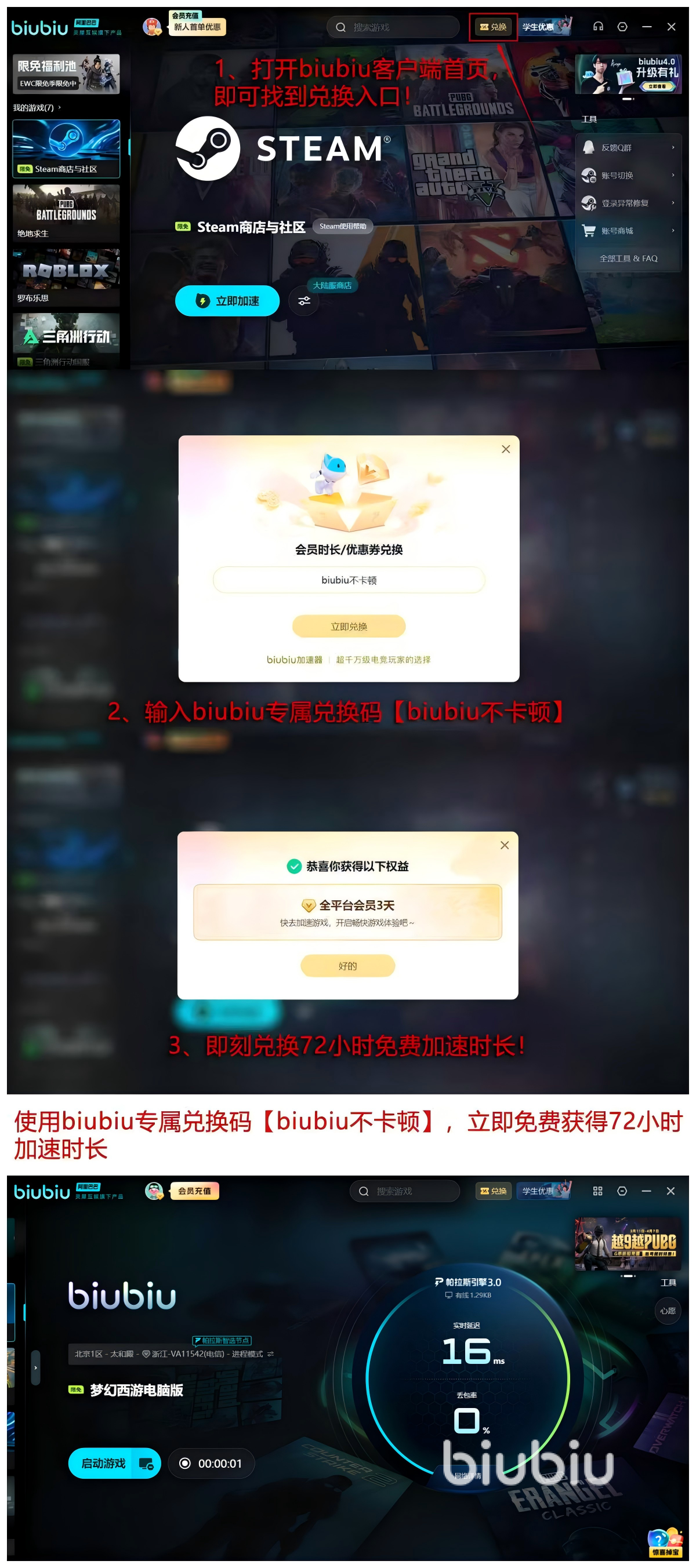 新用户注册后输入口令【biubiu不卡顿】,即可领取72小时全功能加速权益;首次使用用户额外获赠24小时,累计达96小时免费体验期。该权益支持多端通用,适用于PC客户端及移动端模拟器场景。