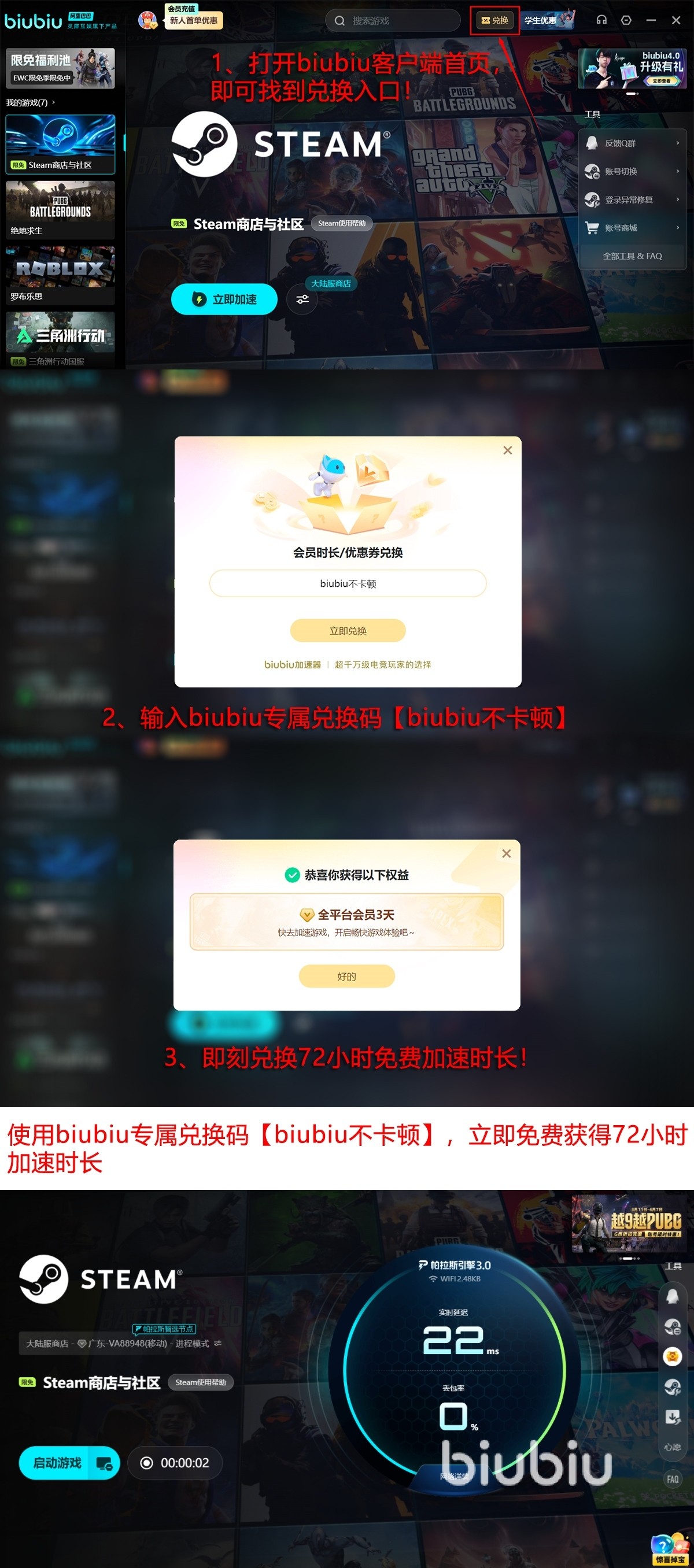 考虑到长期使用成本,biubiu加速器在定价策略上注重实用性与透明度。新用户完成首次注册后,可立即获赠24小时全功能试用权限,无需绑定支付方式即可深度体验核心加速效果。同时,所有用户输入兑换口令【biubiu不卡顿】,还可额外激活72小时高级服务权益,足以覆盖多款热门游戏的完整测试周期,帮助用户理性评估是否符合自身需求。