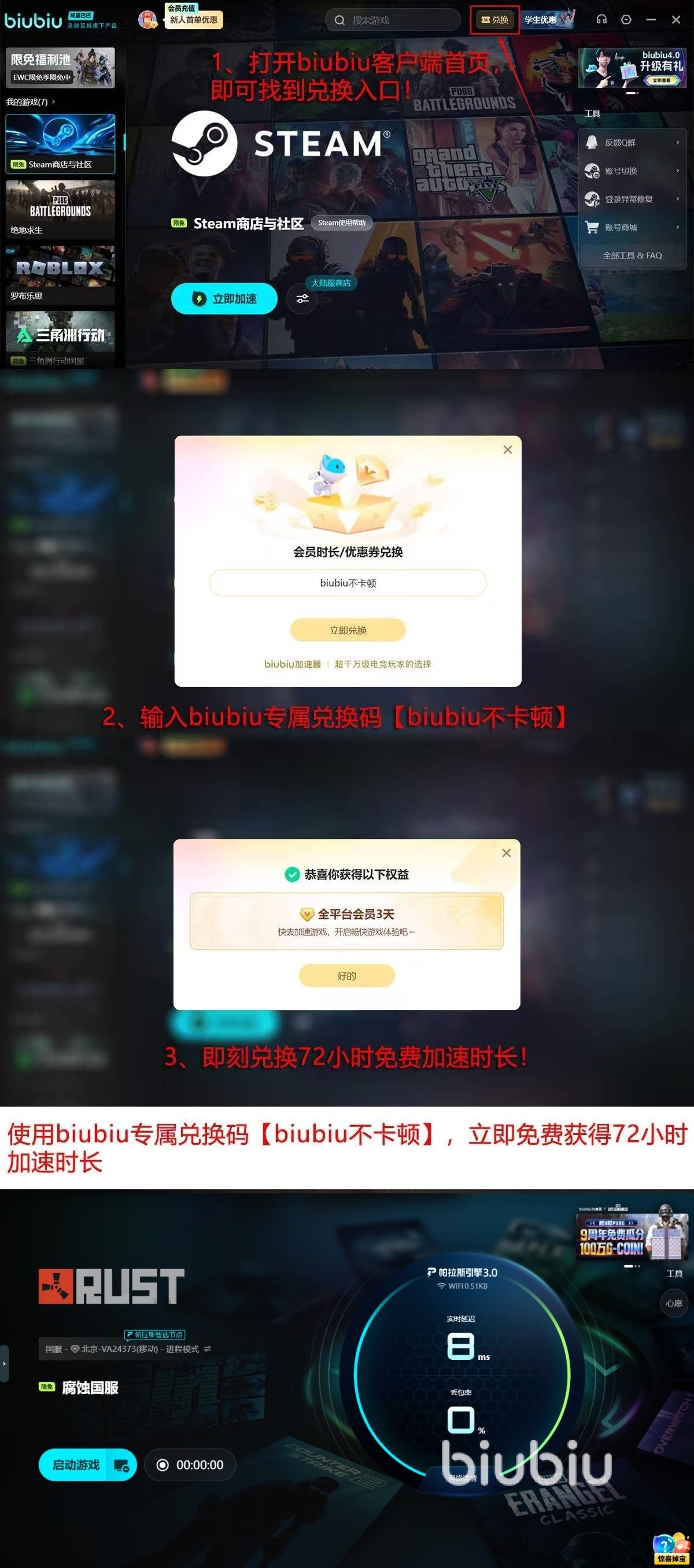 新用户可享受全功能深度体验权益:完成注册即赠24小时完整权限试用;输入激活码【biubiu不卡顿】,额外叠加72小时加速时长,总计获得96小时无限制使用周期,期间可自由切换全球服务器节点、启用高级抗丢包模式及自定义带宽分配策略,零门槛验证产品实效性。