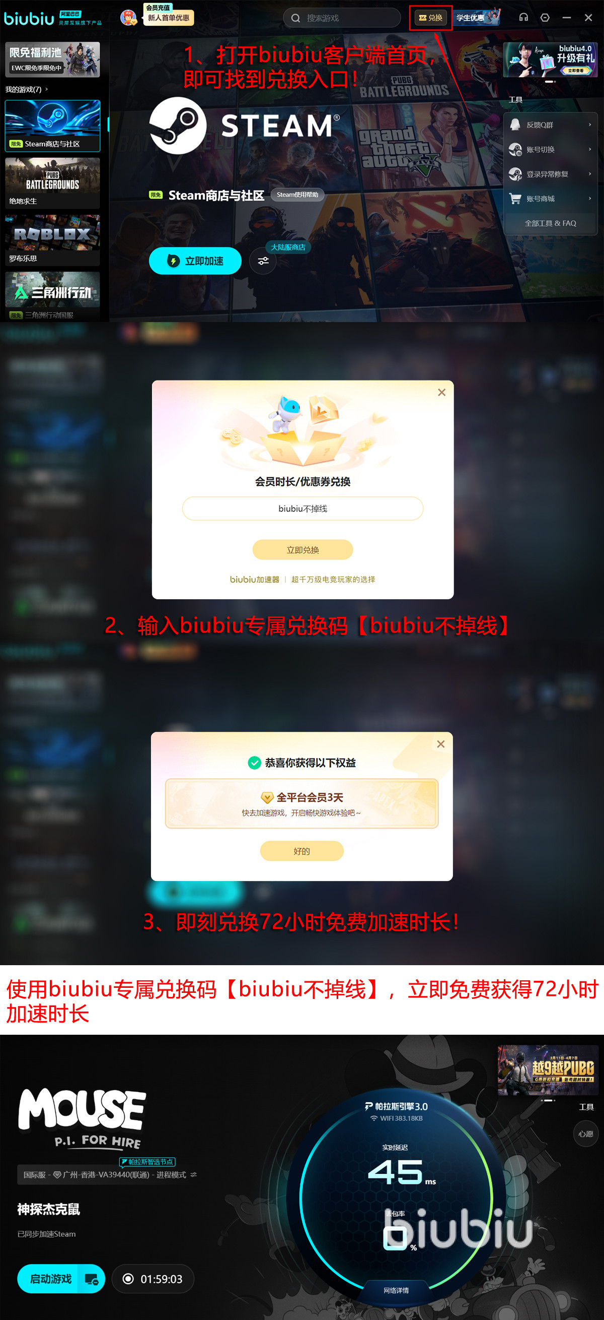 福利层面同样诚意十足:新用户完成注册并登录后,即可领取24小时免费加速时长;叠加使用兑换码【biubiu不掉线】还可额外获得72小时服务权限,总计享有多达96小时的无门槛加速体验。后续持续运营中还将开放更多专属权益,切实降低玩家联机门槛。