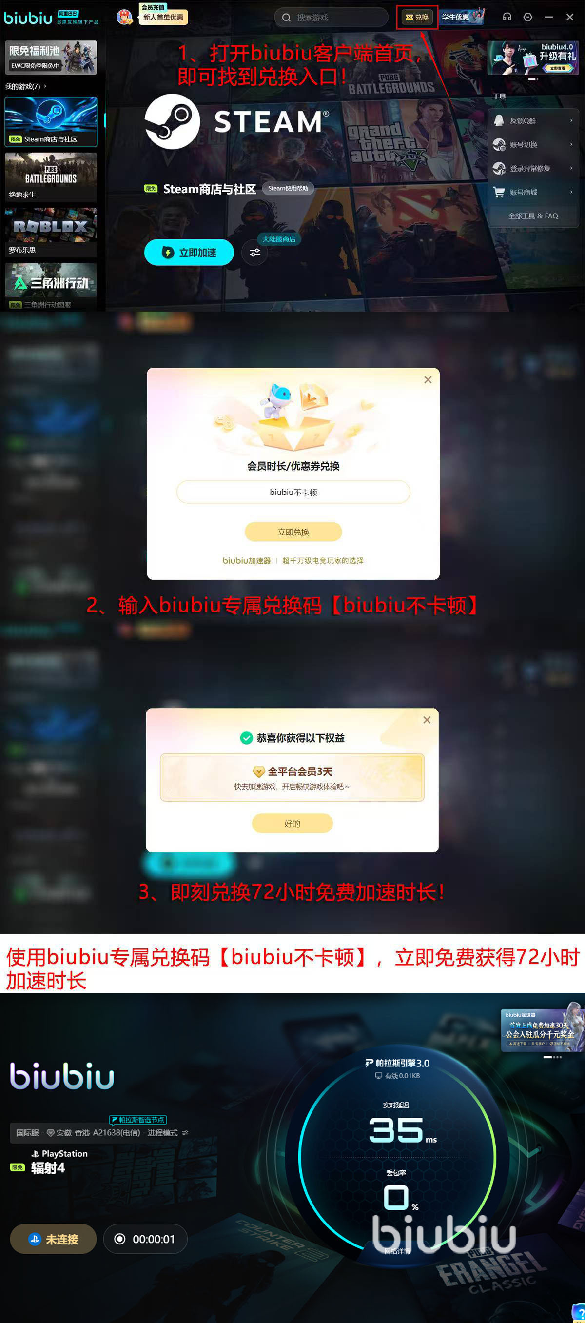 对于当前遇到登录障碍的玩家,建议优先尝试biubiu加速器——相较重装系统、手动配置Hosts或更换硬件等复杂操作,其3分钟内即可完成部署并生效。目前新用户可享累计96小时免费加速时长:注册即赠24小时基础时长;登录后前往首页“兑换中心”,输入口令【biubiu不卡顿】,即可额外领取72小时高级加速权益。