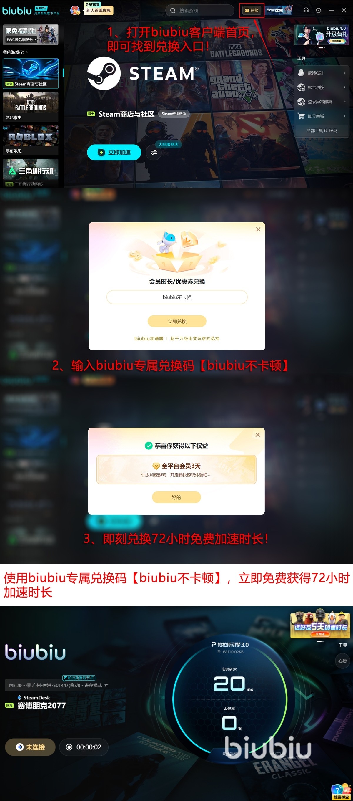 新用户完成注册后,系统自动发放24小时全功能免费试用权限。输入专属兑换码【biubiu不卡顿】,即可额外领取72小时高级服务时长。新老用户叠加后,总计可享96小时无限制体验期——足够完整通关主线+三大支线,并流畅运行包含高清材质、AI增强NPC行为等高负载Mod。