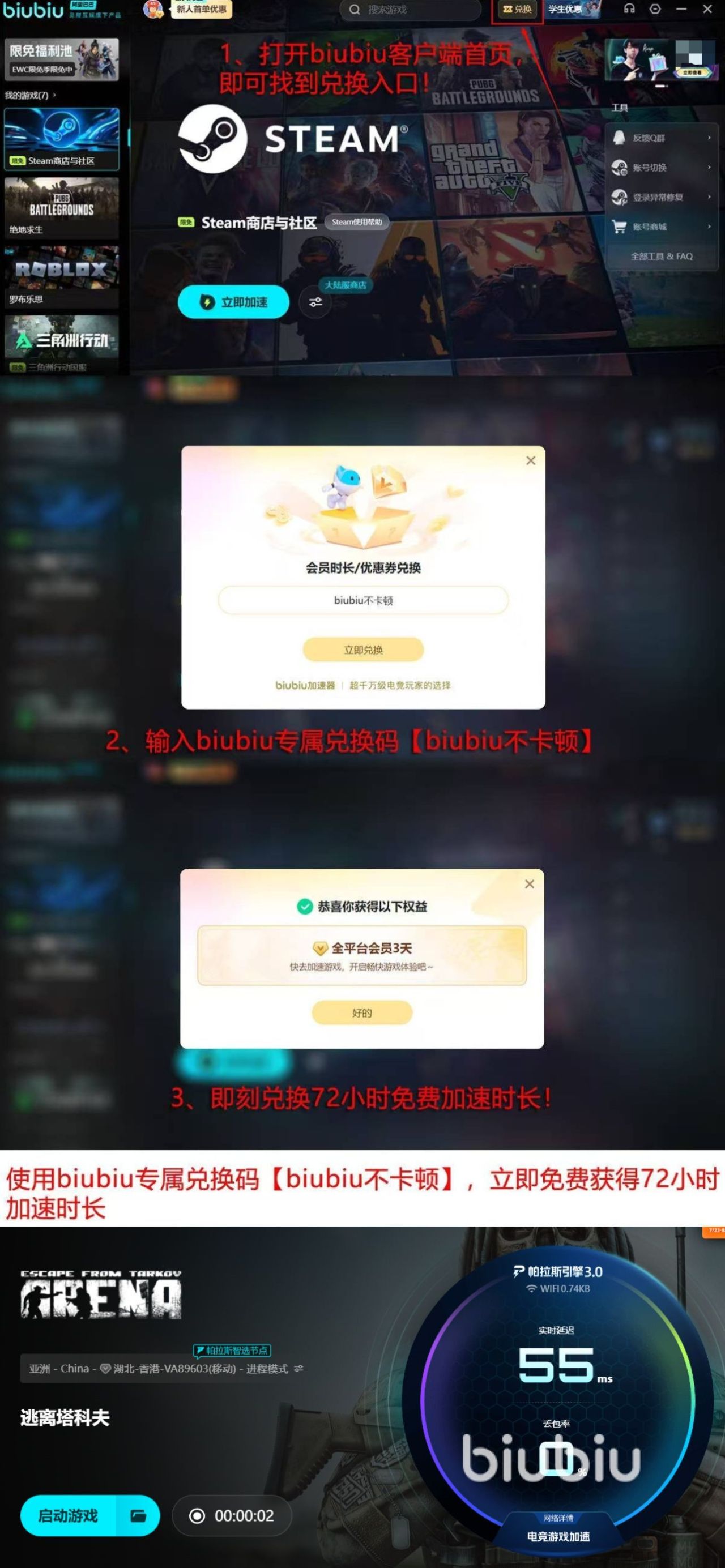 新用户注册之后就会自动开启首日24小时全部功能免费试用权,输入【biubiu不卡顿】,还可以立即生效72小时加速时长,累计可以享受到96小时的免费加速服务。