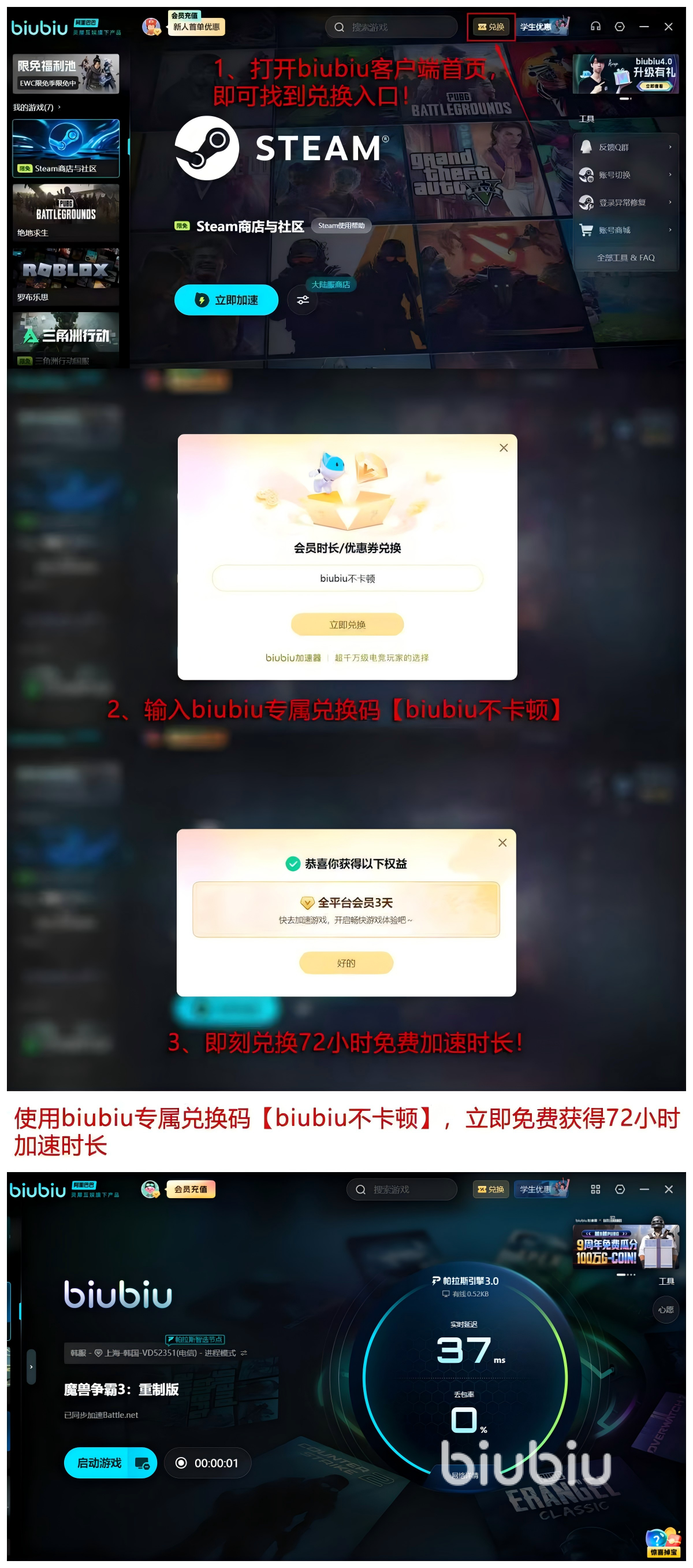 同时各位可以使用【biubiu不卡顿】口令,该口令非常有用,大家可以获取72小时的加速器时间,并且累计叠加新人的加速福利24小时,大家也就是说可以获得96小时的加速时间,这些时间绝对是非常的丰富了,对于想要体验,或者白嫖一段时间用户都是非常的好用了。