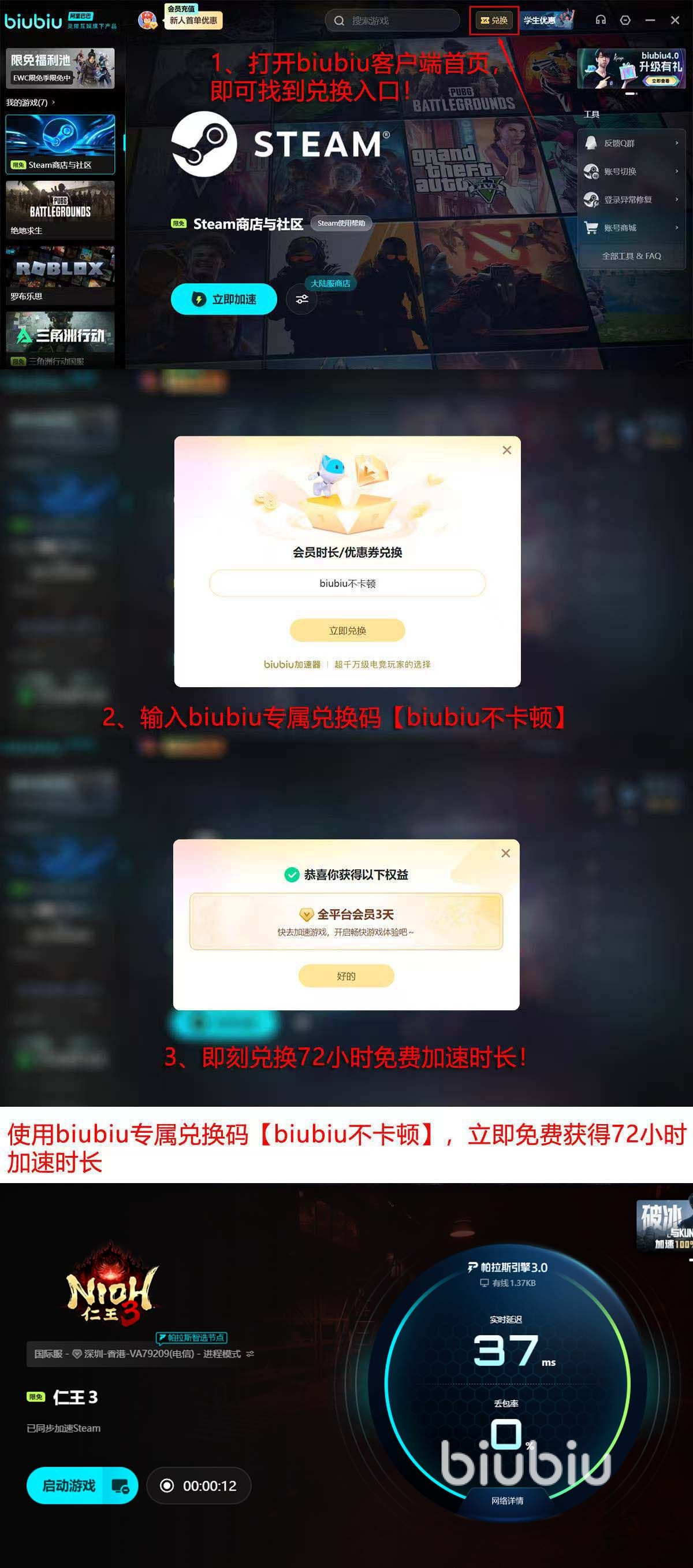 新用户使用biubiu加速器还会有超值的优惠。注册biubiu加速器账号之后就可以得到24小时的免费试用期。更重要的是输入【biubiu不卡顿】就可以获得72个小时的加速时间,可以满足玩家在网络环境、游戏场景等各方面不同的稳定性测试需求,亲自体会到加速器带来的飞跃式的体验改善。