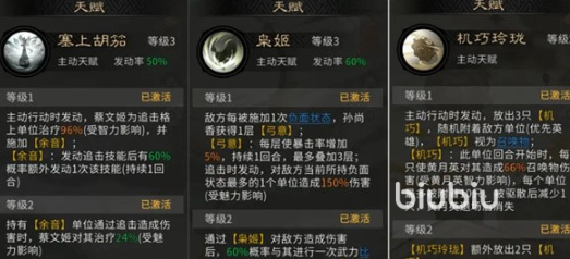 战斗节奏围绕三层技能联动展开:首回合蔡文姬释放【塞上胡笳】,既提供治疗回复,又赋予孙尚香“余音”状态,使其获得额外一次追击机会。孙尚香随即触发【枭姬】,优先锁定敌方负面层数最高的目标,造成高额单体伤害,并有60%概率发动连击;若存在余音,则可再次追击,形成三段式爆发输出链。