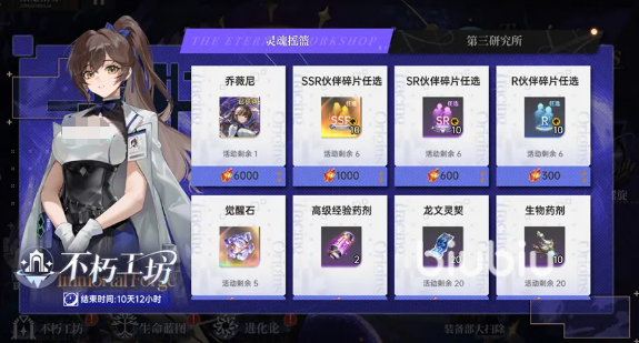 兑换系统分为两大模块:其一为「灵魂摇篮」,支持使用「龙血金」兑换乔薇尼本体、SSR伙伴碎片及多项养成材料,所有商品均为限时上架;其二为「第三研究所」,提供每日免费「龙血金」领取服务。若资源不足,亦可通过工坊礼包进行补充,但建议优先通过免费途径完成核心目标。