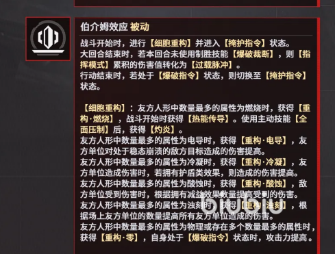 被动能力【细胞重构】于战斗开始时自动触发,初始即进入掩护指令状态。若在回合结束时未使用终极技能,则已累积的指挥模式伤害将自动转化为过载脉冲。该被动不仅保障起手稳定性,亦提供容错空间,进一步强化其机制闭环的完整性。