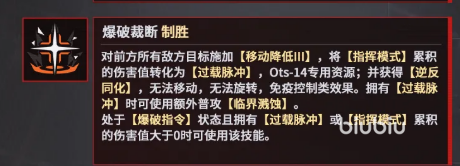 综上,OTs14的战斗逻辑以“掩护/爆破双指令系统”为轴心,通过技能联动、状态转换与伤害转化形成完整输出闭环。其机制深度适配多种主流配队思路,在保证单体爆发强度的同时兼顾团队功能性,属于兼具操作上限与实战容错率的高策略性火力单位。对于追求灵活组队方案与阶段性高爆发输出的玩家而言,该角色具备明确的战术定位与长期培养价值。
