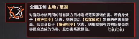 一技能【全面压制】为范围攻击,作用于目标所在格及其相邻敌方单位。该技能效果高度依赖当前指令状态:处于掩护指令时,可提升技能伤害累积量;切换至爆破指令后,基础伤害系数提升100%,且额外依据初始暴击伤害值进行加成。两种状态下的实际伤害表现差异显著,需结合战场局势与指令切换时机精准释放。