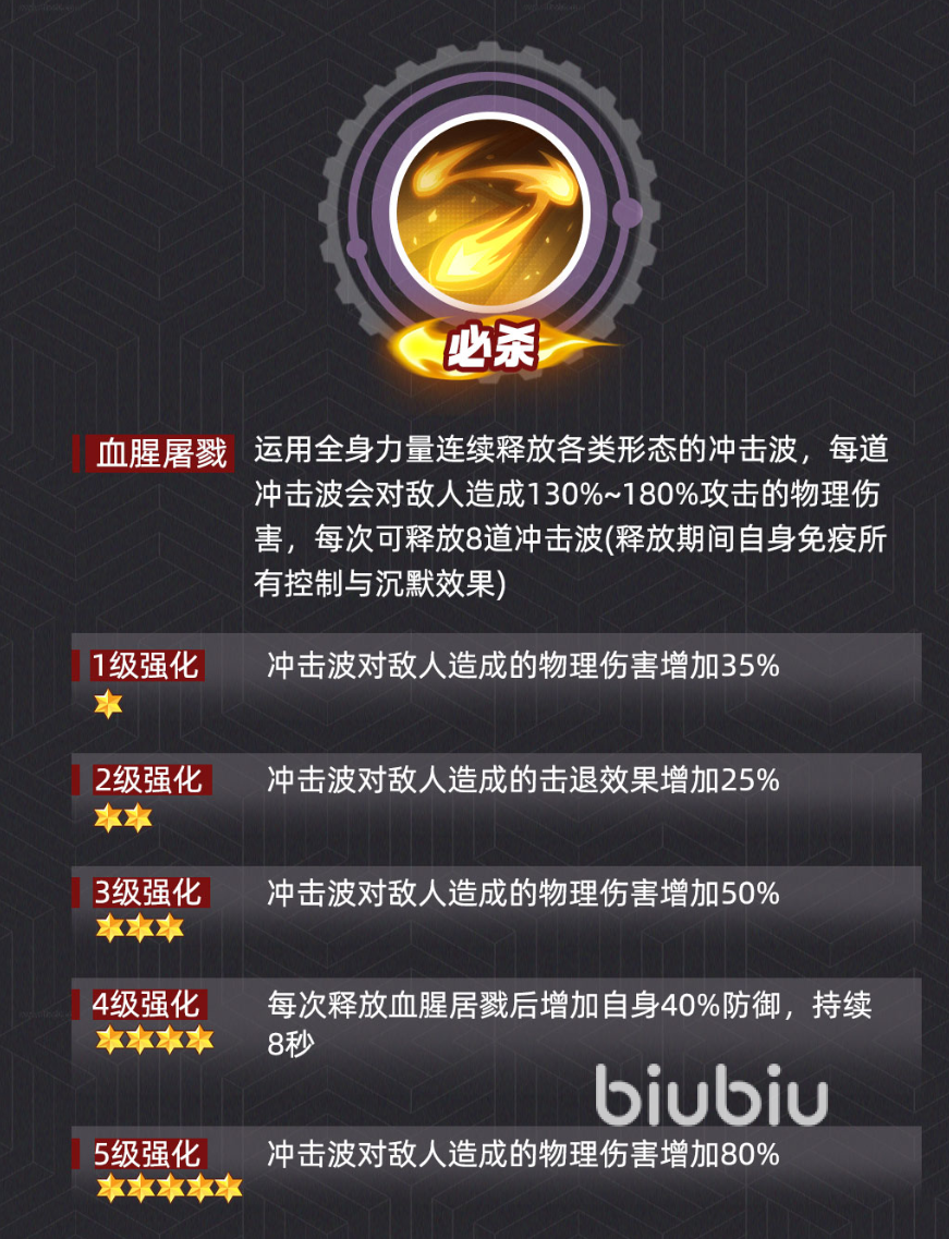 天赋系统进一步放大了他的越阶作战能力。其SR级主动技能“帝王波”不仅造成高额物理伤害,更附带强力击退效果,可有效打断敌方连招、分割阵型;而SSR级特技则具备周期性全屏覆盖打击特性,攻击范围广、冷却可控,在持久战中形成稳定压制链。