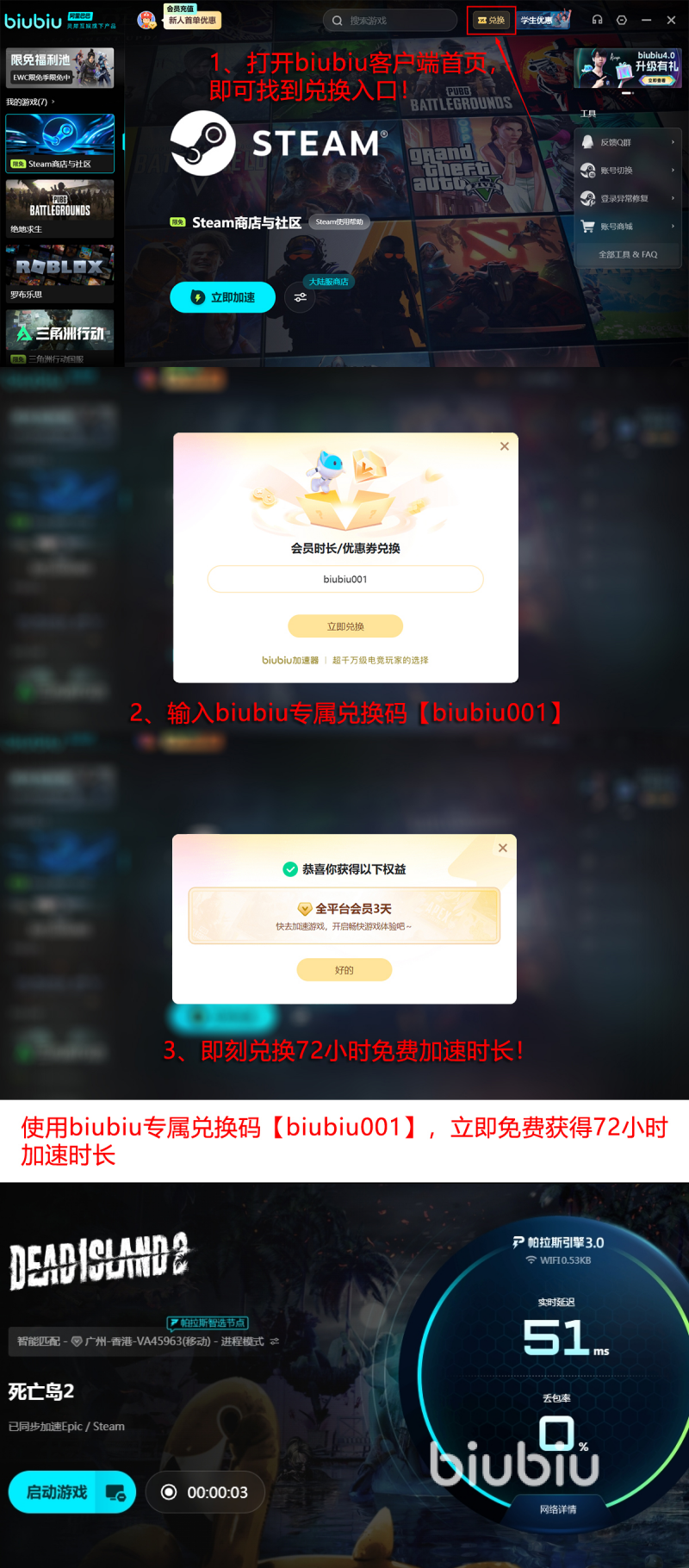 这款加速器是PUBG冠军玩家小叮当指定加速器,可以得到职业选手以及顶尖战队的认可,那实力自然是很不错的。福利也是比较不错的,所有的用户都可以使用【biubiu001】领取3天免费加速时长,新用户在首次注册之后,还能额外的获得24小时免费加速时长。两者放在一起使用,那新手就可以解锁96小时,相当于可以免费4天。