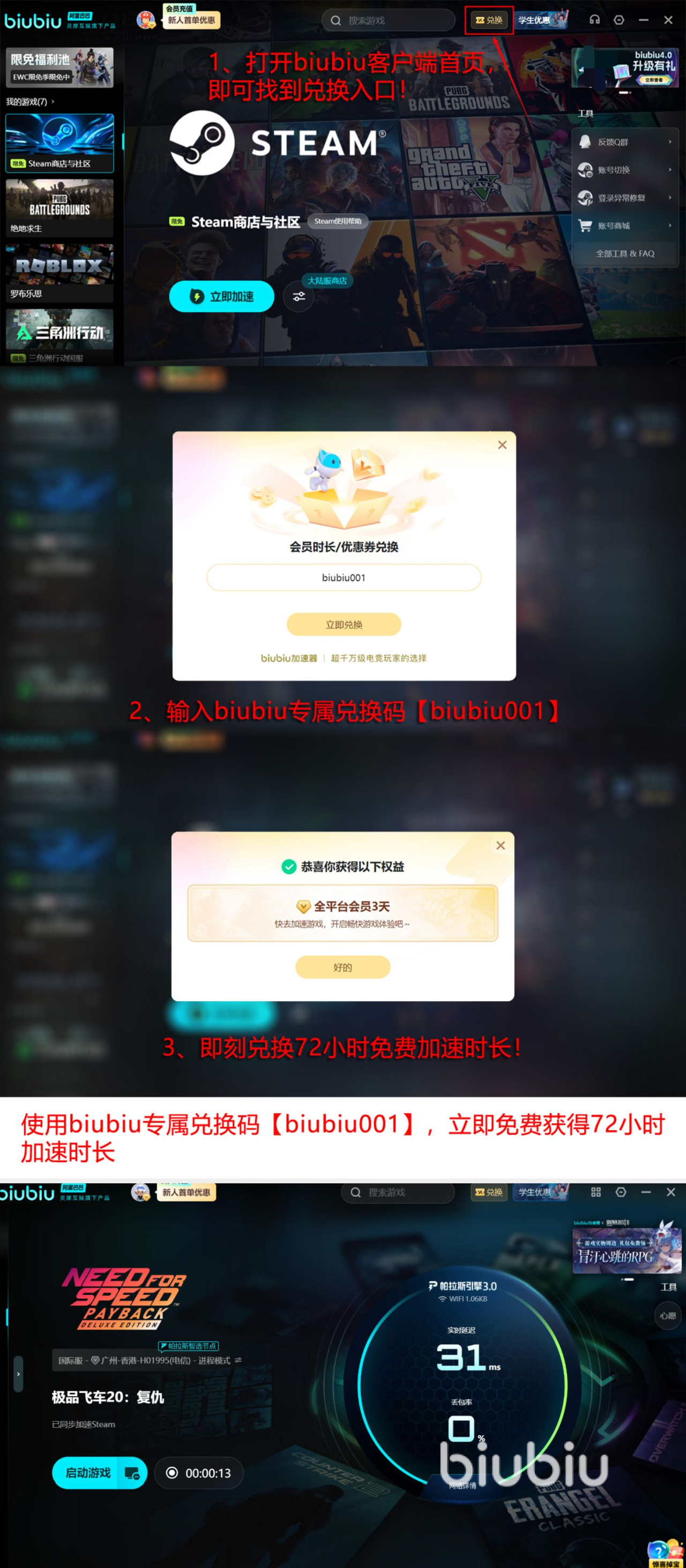 现在只要是新用户注册biubiu加速器的账号,就能够获得24小时的免费使用时间,在首页使用兑换码biubiu001又能够在额外的多免费使用3天,总计96小时。