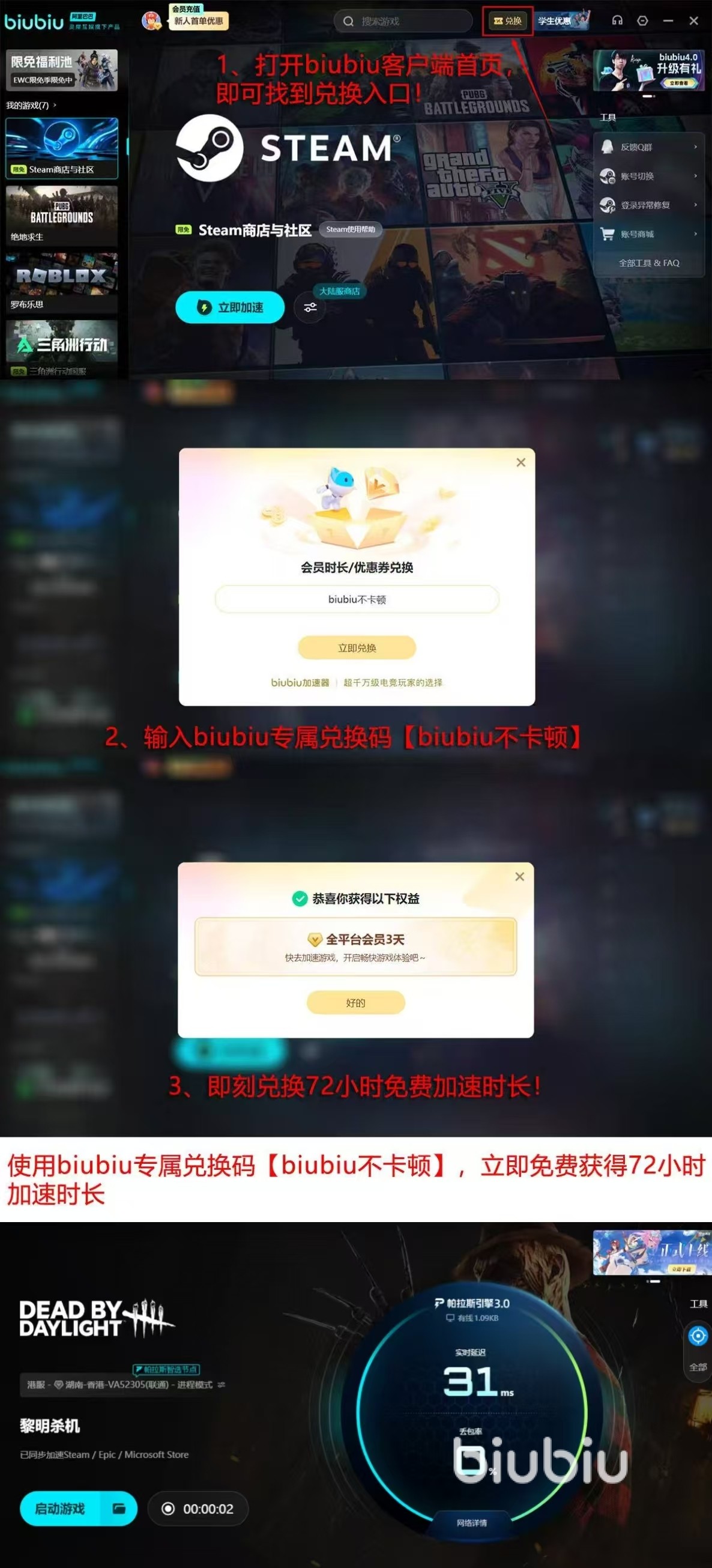 biubiu加速器除了技术方面做得好外,还会给新用户发放许多优惠。只需要注册biubiu加速器账号,就可以得到24小时的免费试用期,体验全方位的加速效果。而注册时所输入的兑换码【biubiu不卡顿】,可以享有72小时内免费加速的时间,既可以充分地对biubiu加速器的性能进行测试,又可以在没有任何费用的情况下,得到和竞技对手一样的游戏体验。