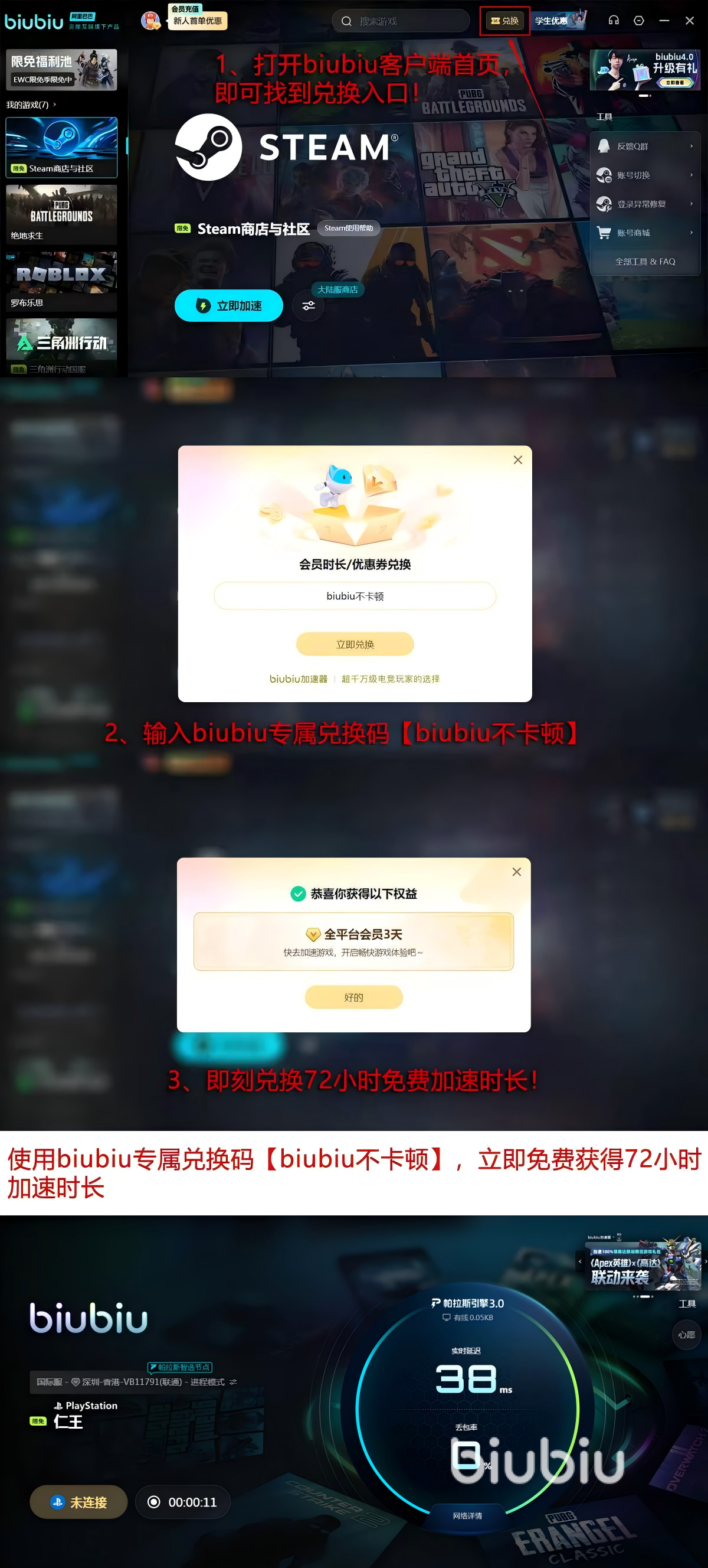 优惠多多,错过就亏,注册账号后,新用户抓紧登录,迎面就送来个大礼包给大伙,然后就能畅用24小时超值加速服务了。其实还有更优惠的赠送活动,大家跟着下图的教程来,利用【biubiu不卡顿】得到的可是72h额外服务时间,那就好好享受新人的96小时加速权益吧。