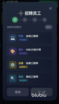 人才系统采用深度策略化设计,涵盖七大核心职能方向:产品、研发、设计、运营、市场、财务与法务。每位员工具备五维能力模型(专业力、执行力、协作力、创新力、稳定性),数值差异显著影响岗位适配性与团队协同效率。招聘环节需综合评估候选人资质与薪资预期,在有限人力预算下完成骨干配置;入职后可通过内部培训体系定向提升单项能力,实现组织能力的可持续进化。