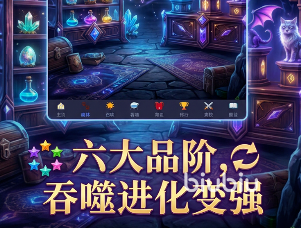 游戏采用轻量化设计思路,前期无需反复刷图或等待冷却,仅需引导魔宠接触可吞噬目标,数分钟内即可观察到等级提升、技能解锁等实质性变化。战斗数值增长直观,每次成功吞噬都伴随明显的属性增幅与视觉反馈,强化“爽感驱动”的沉浸式游玩节奏。