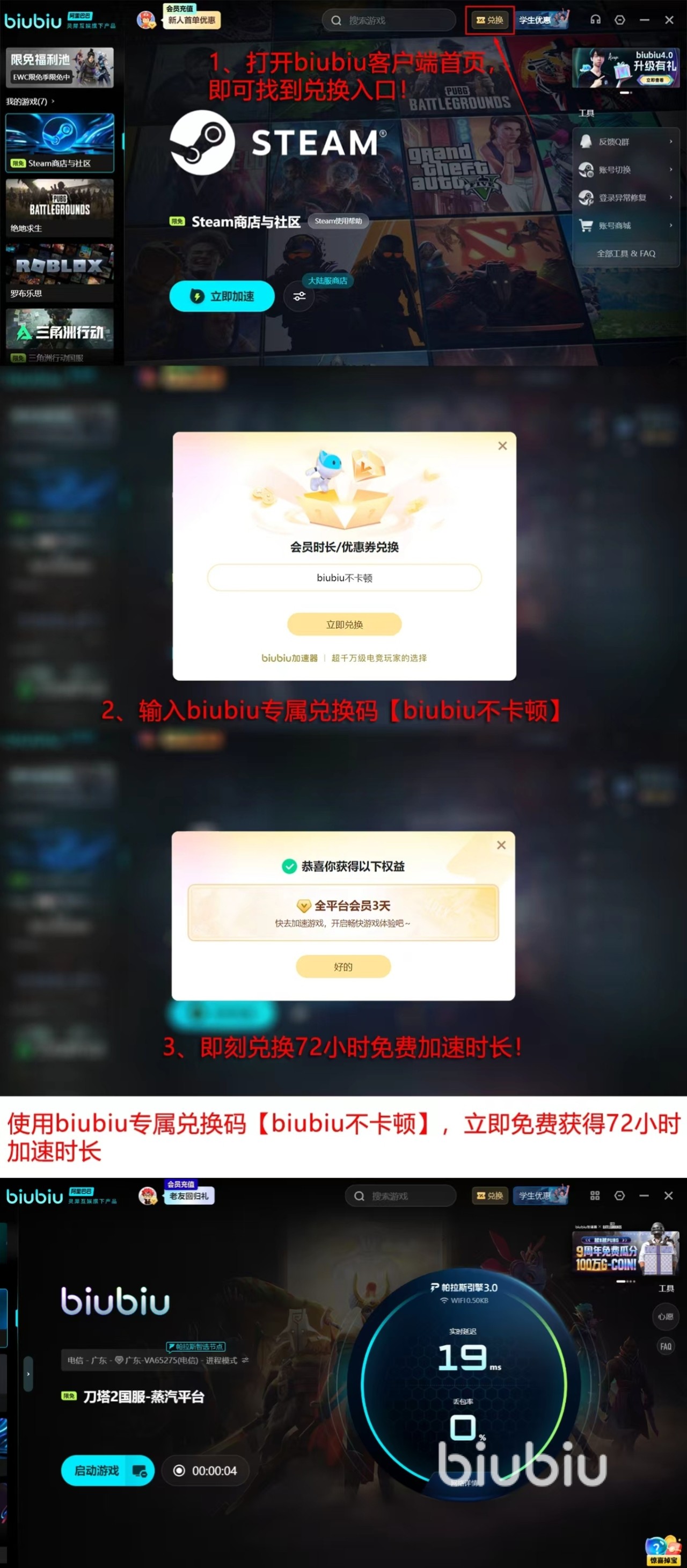 福利方面,新用户注册即赠24小时全游戏免费加速权限,足以完成多场高强度排位验证效果;老用户输入兑换码【biubiu不卡顿】可额外领取72小时加速时长,新老叠加共计96小时。目前DOTA2国服加速服务已纳入biubiu限免活动范围,未领取任一福利的用户仍可直接开启加速体验。