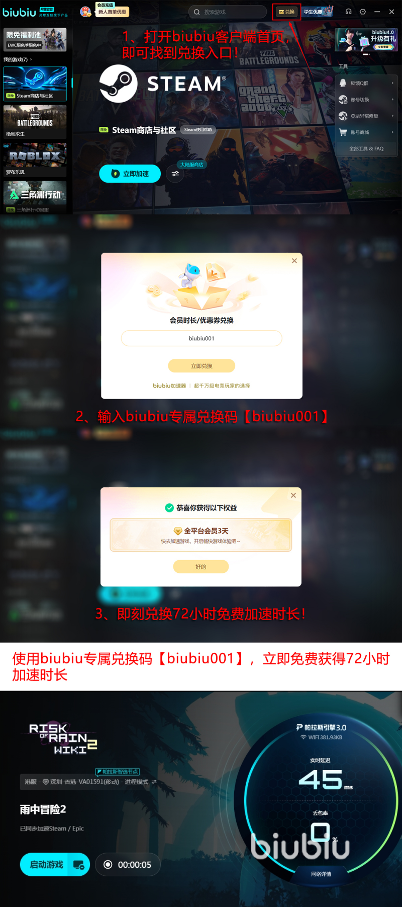 目前平台面向新用户提供双重福利叠加机制:注册即赠24小时全功能体验时长;另附专属兑换码【biubiu001】,可额外领取3天加速权限。两项权益合并使用,最高可享96小时无门槛免费服务,零成本体验专业级联机保障。