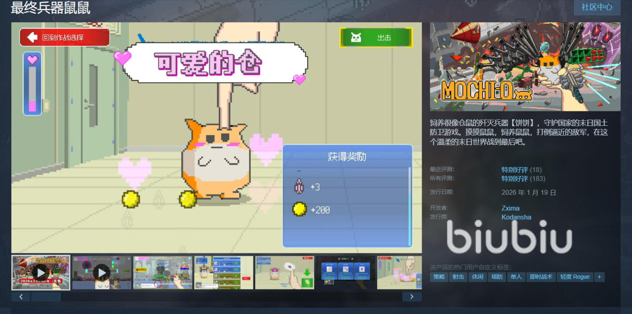 2026年03月19日 06:48 来源:小速《最终兵器鼠鼠》作为一款融合策略塔防与高精度动作射击玩法的创新作品,已于2026年1月19日正式登陆Steam平台并开启发售。游戏上线后迅速引发玩家关注,其核心机制围绕“歼灭兵器培育—精准瞄准—资源回收—战力成长”展开:玩家需在动态战场中部署自研兵器,通过毫秒级响应的射击操作击溃敌方单位,每场胜利均可拾取关键资源、积累经验值,持续强化角色能力体系。目前游戏已内置超数百种外观装饰道具,支持自由组合搭配,满足个性化表达需求。