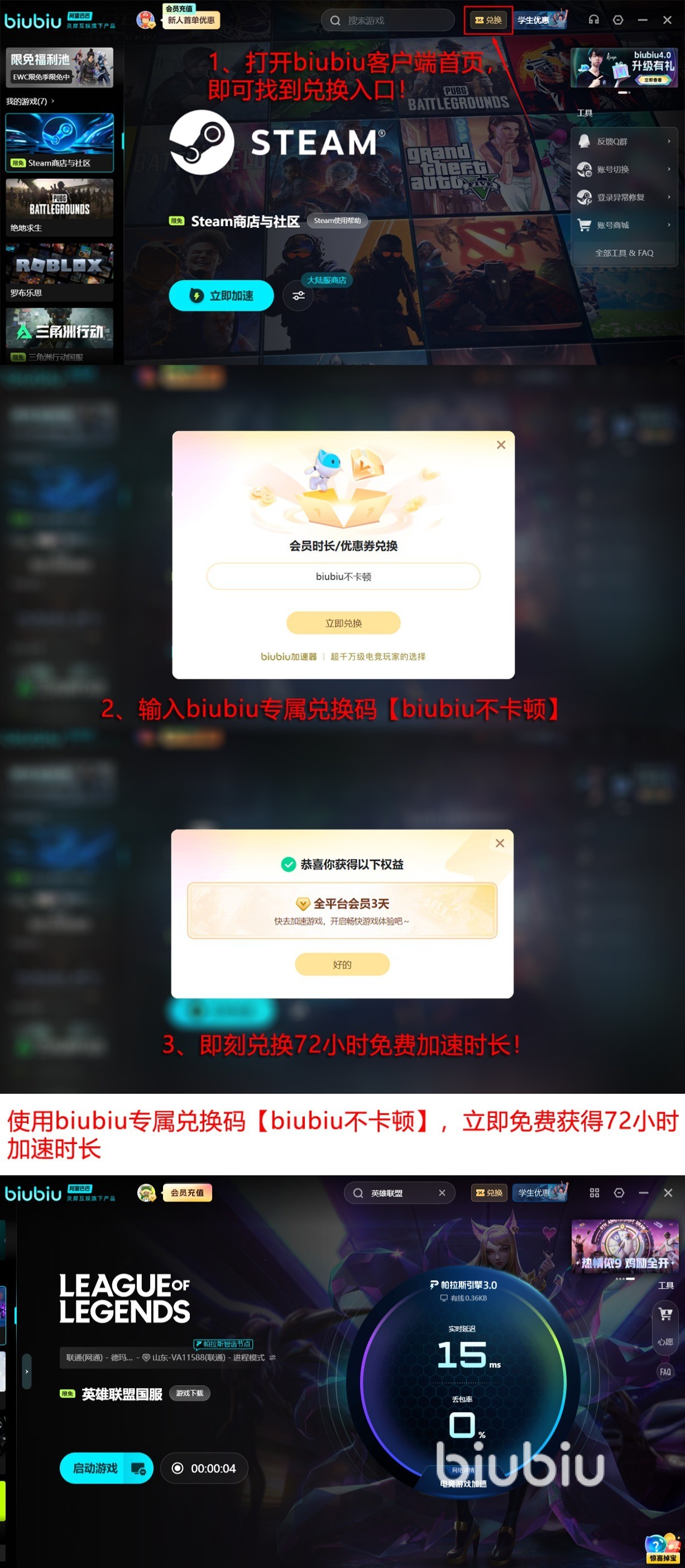 若已完成显卡驱动更新(建议使用NVIDIA Game Ready Driver 536.67或AMD Adrenalin 23.7.1及以上版本)、关闭后台占用进程、调整游戏内画质为“中等”并启用垂直同步,仍持续出现阶段性卡顿,则基本可判定为网络层问题。当前biubiu加速器面向新用户提供24小时无门槛免费试用权限,注册即启,无需绑定支付方式。此外,所有用户(含老用户)在兑换中心输入激活码【biubiu不卡顿】,即可额外领取72小时连续加速权益,完整覆盖一局排位赛+两场巅峰极速匹配的流畅体验周期。