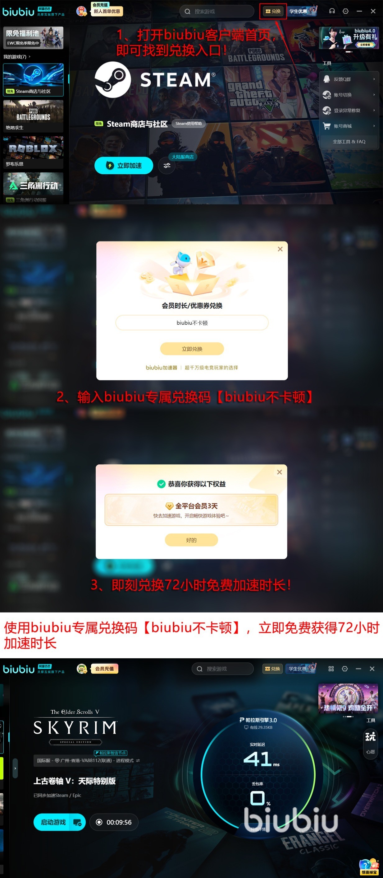 当单人冒险模式切换至多人协作场景时,网络质量直接影响团队协同效率。例如《DOTA2》中技能释放帧率偏差超过40ms即可能造成致命失误。新用户注册biubiu加速器账户后,系统自动发放24小时全游戏加速权益;老用户可通过官方兑换入口输入口令【biubiu不卡顿】领取额外72小时加速权限,该组合策略可满足连续多日高强度联机需求。