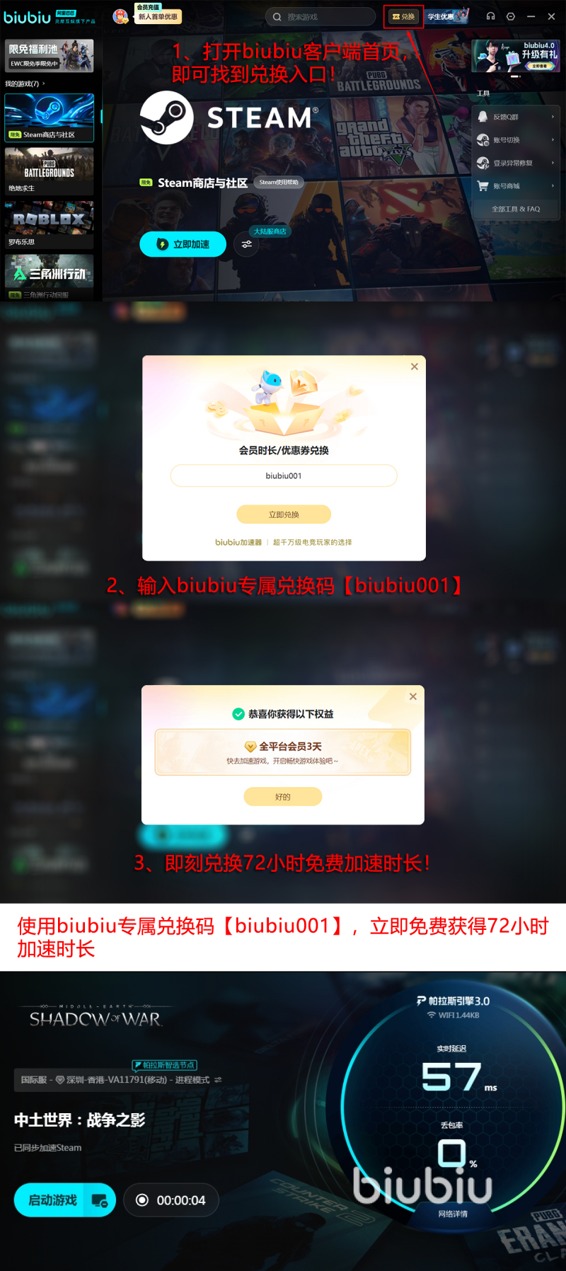 目前biubiu加速器提供多项零门槛福利:所有用户均可在搜索栏输入游戏名称后一键启用加速。通过输入激活码【biubiu001】,即可领取3天免费加速时长;新注册用户还可额外兑换24小时专属加速权益。两项福利叠加使用,总计可享96小时无费用加速服务,为解决《中土世界:暗影之战》闪退问题提供切实保障。