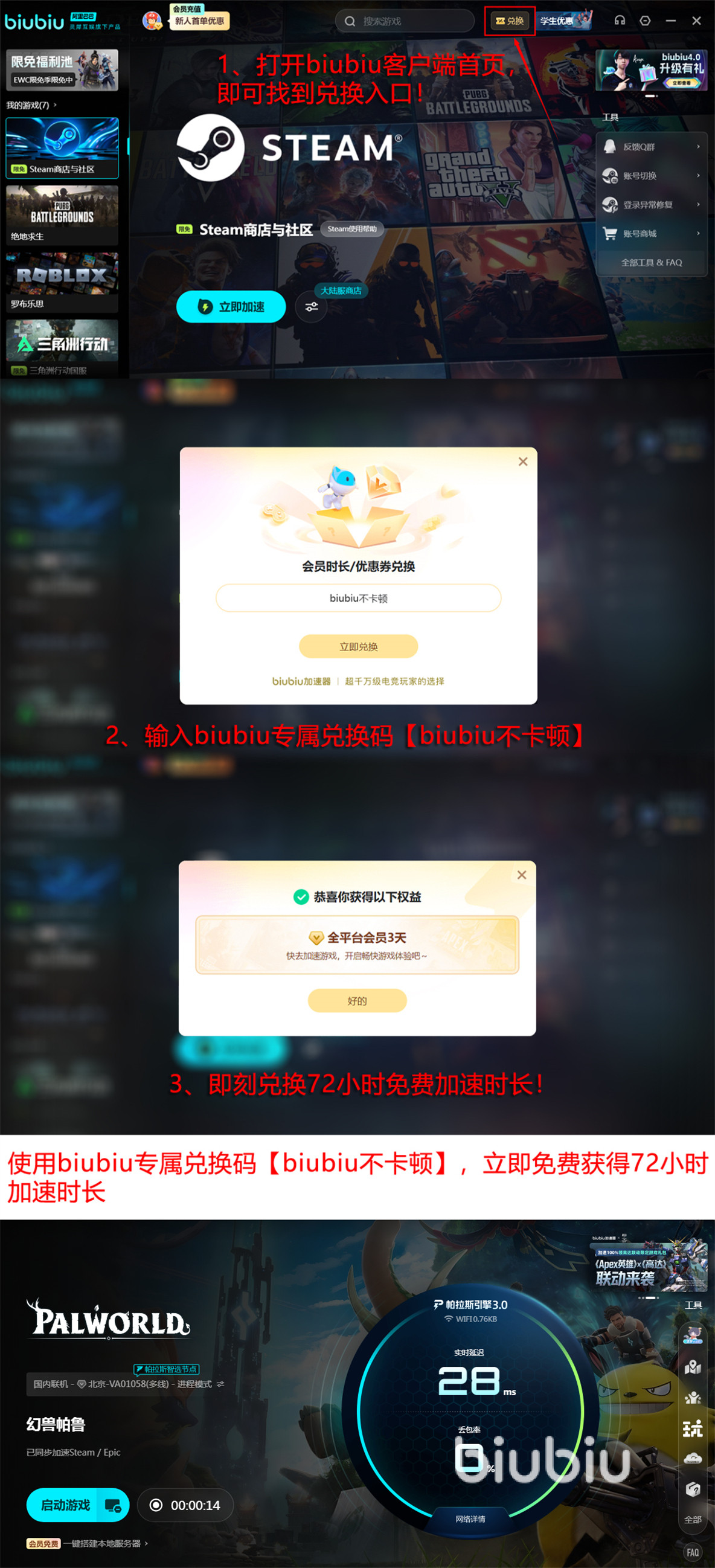 新用户可通过注册账号获取24小时免费加速时长,用于实际测试加速效果。另提供通用兑换码【biubiu不卡顿】,每个账户限用一次,可额外获得72小时全功能使用权。平台同步整合《幻兽帕鲁》专属攻略库、版本更新日志、帕鲁图鉴数据库及玩家交流社区,内容均围绕游戏核心机制设计,助力新手快速掌握帕鲁驯养逻辑、地形资源分布规律及联机协作技巧。