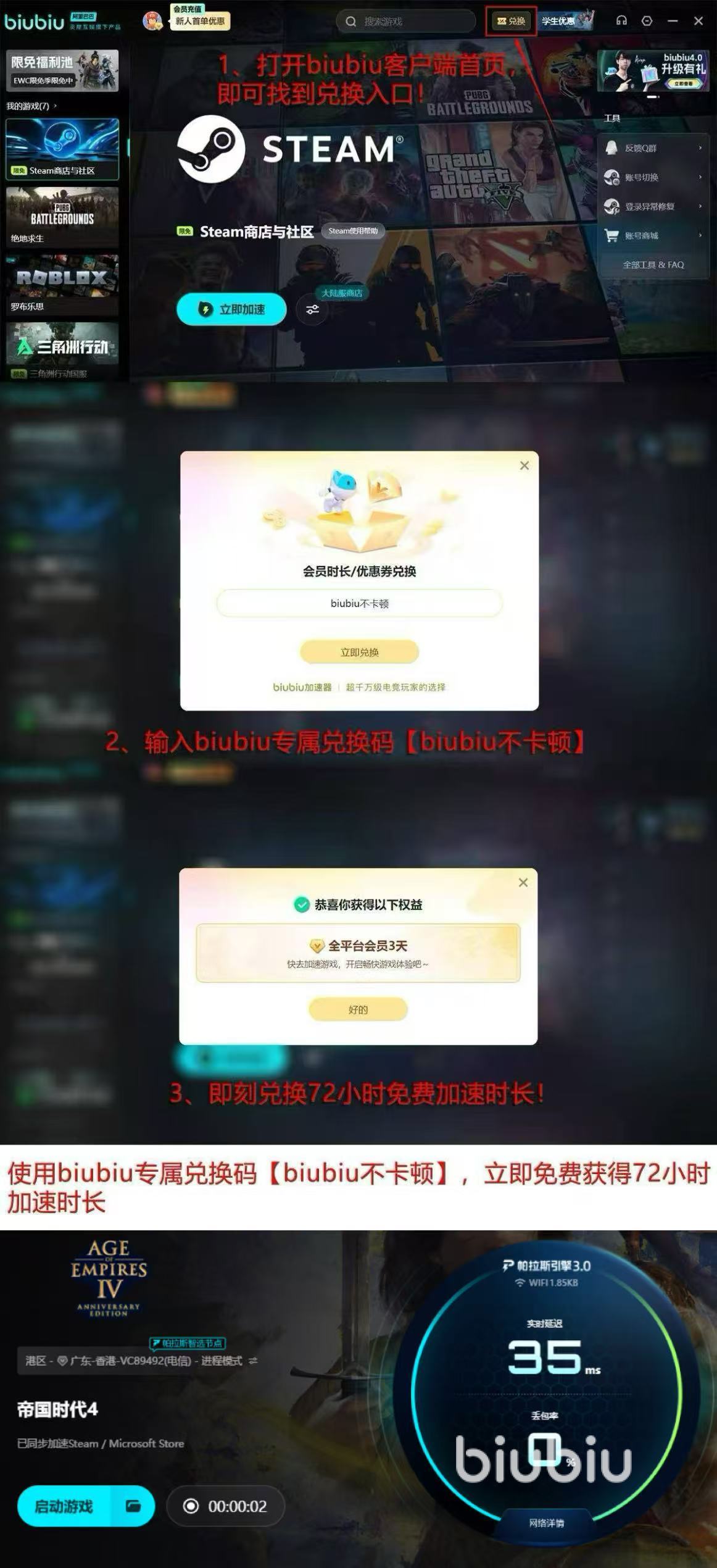 为帮助新用户快速上手,biubiu加速器同步开放新人激励计划:注册即赠24小时全节点加速权限;在兑换中心输入激活码【biubiu不卡顿】,可叠加领取72小时专属时长。两项权益合计达96小时,覆盖单局战役模式(平均2.5小时)、标准1v1对战(约18分钟/局)及多人合作任务等全部玩法场景,确保零门槛体验完整内容。