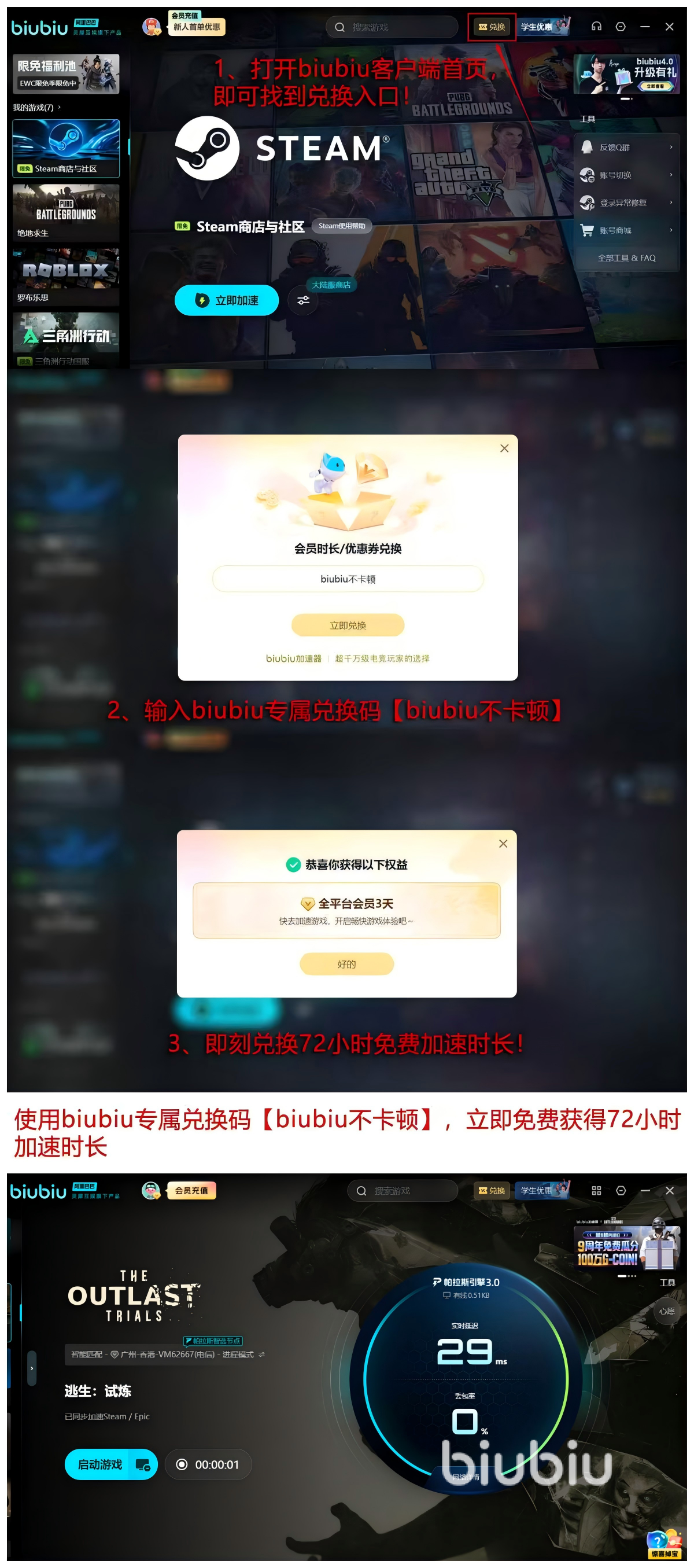 现推出限时福利:输入口令【biubiu不卡顿】,未领取过权益的账号可获72小时免费会员权限;新注册用户额外叠加24小时,总计达96小时。该体验周期足以完整覆盖多轮高强度联机测试,便于用户真实评估其加速效能。