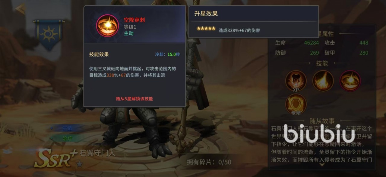 技能体系围绕“防护—反制—续航”三层逻辑展开: 一技能【石刃攻击】在造成基础伤害的同时,有20%概率为主角生成岩石护盾,吸收相当于主角最大生命值5%的伤害; 二技能【空降穿刺】以三叉戟重击地面,对范围内敌人造成范围伤害并施加击退效果,兼顾控制与输出; 终极技能【石像附体】为其核心机制——石翼守门人化为石像融入主角,立即提供相当于主角最大生命值20%的护盾,并使主角获得40%随从技能减伤效果,同时每秒恢复5%最大生命值。升星后,每次成功生成护盾还将额外触发3秒无敌状态。这一组合效果使其在竞技场对战、高难度副本攻坚等需要极限生存窗口的场景中表现尤为突出。