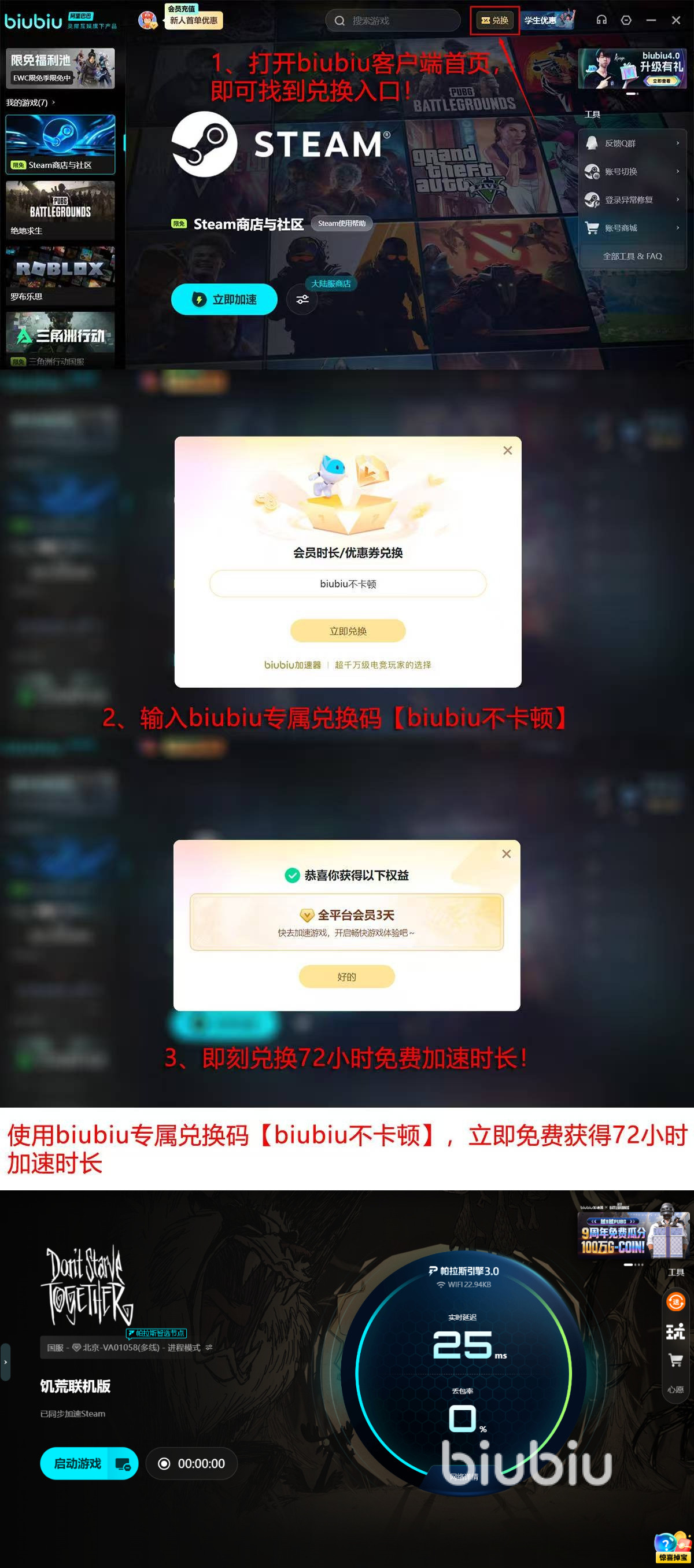 新用户注册即可享首日24小时全功能免费试用;激活时输入优惠码【biubiu不卡顿】,额外获赠72小时加速时长,累计可达96小时深度体验周期,充分验证其在《饥荒联机版》中的实际优化效果。