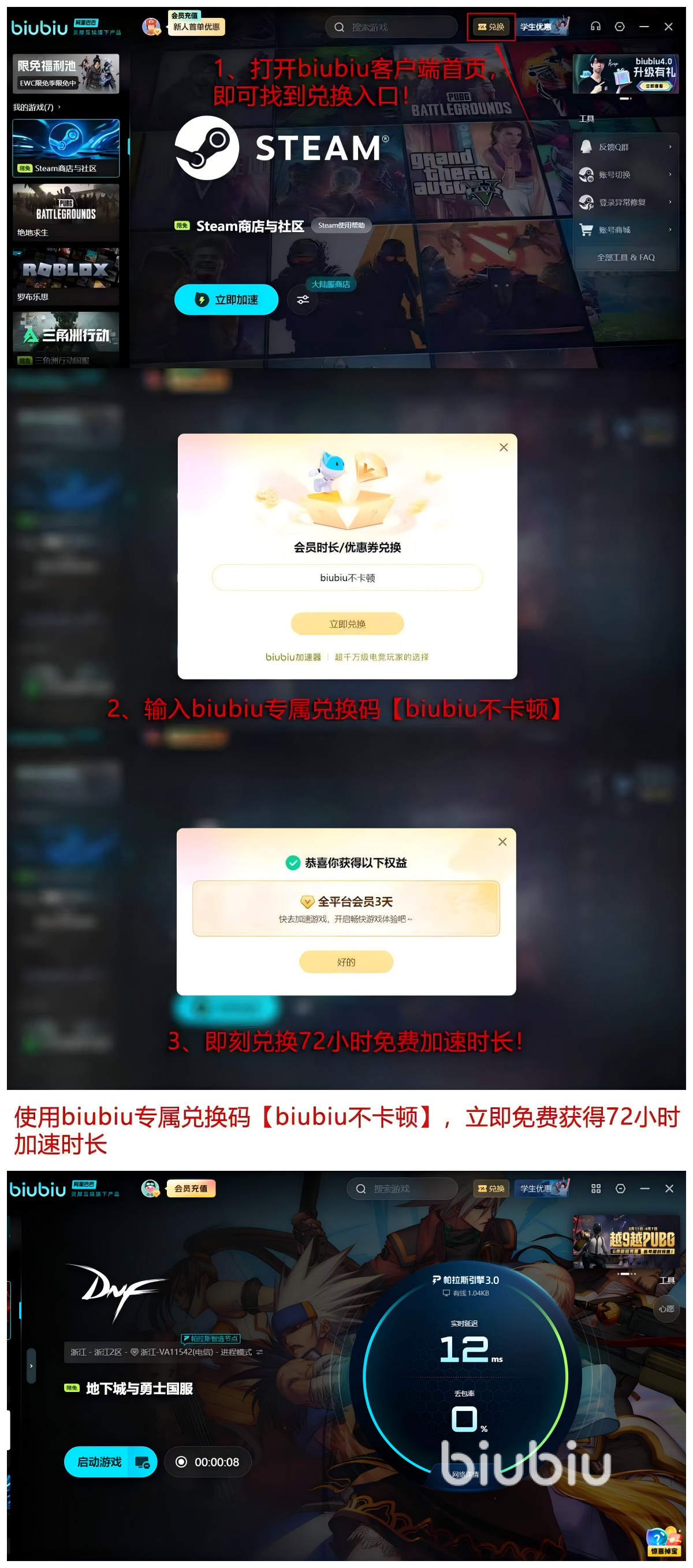 新用户专属福利:输入口令【biubiu不卡顿】即可领取72小时高级加速时长,叠加注册即赠的24小时体验权益,总计可享96小时无限制加速服务。该权益适用于尚未开通会员的玩家,是深度测试稳定性与加速效果的理想窗口期。