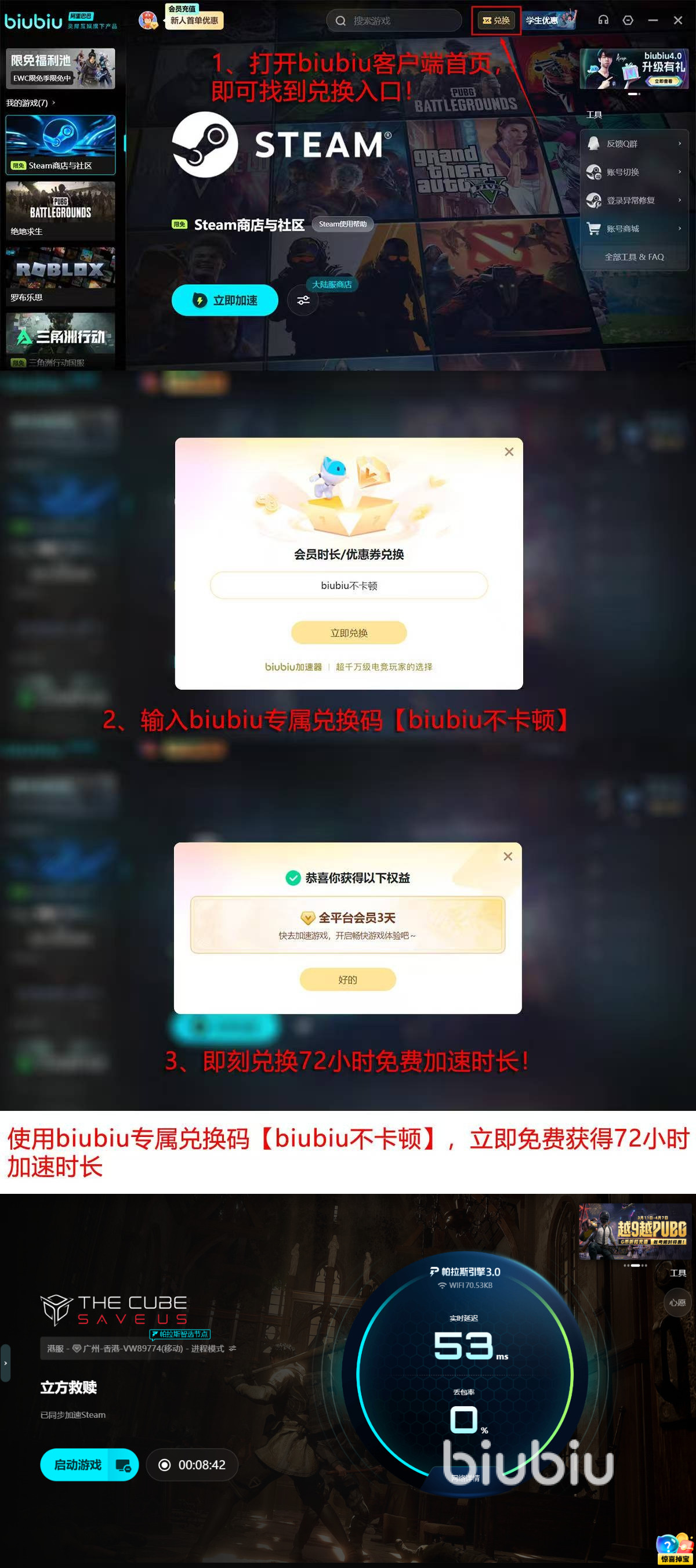 目前新用户注册biubiu加速器,可以立即获得24小时全部功能免费试用资格,并且输入【biubiu不卡顿】可再额外得到72小时顶级加速时长,两个重大优惠叠加在一起,畅享96小时的免费高速网络体验,够你深入立方体中心,初步探索废土最深层的秘密了。