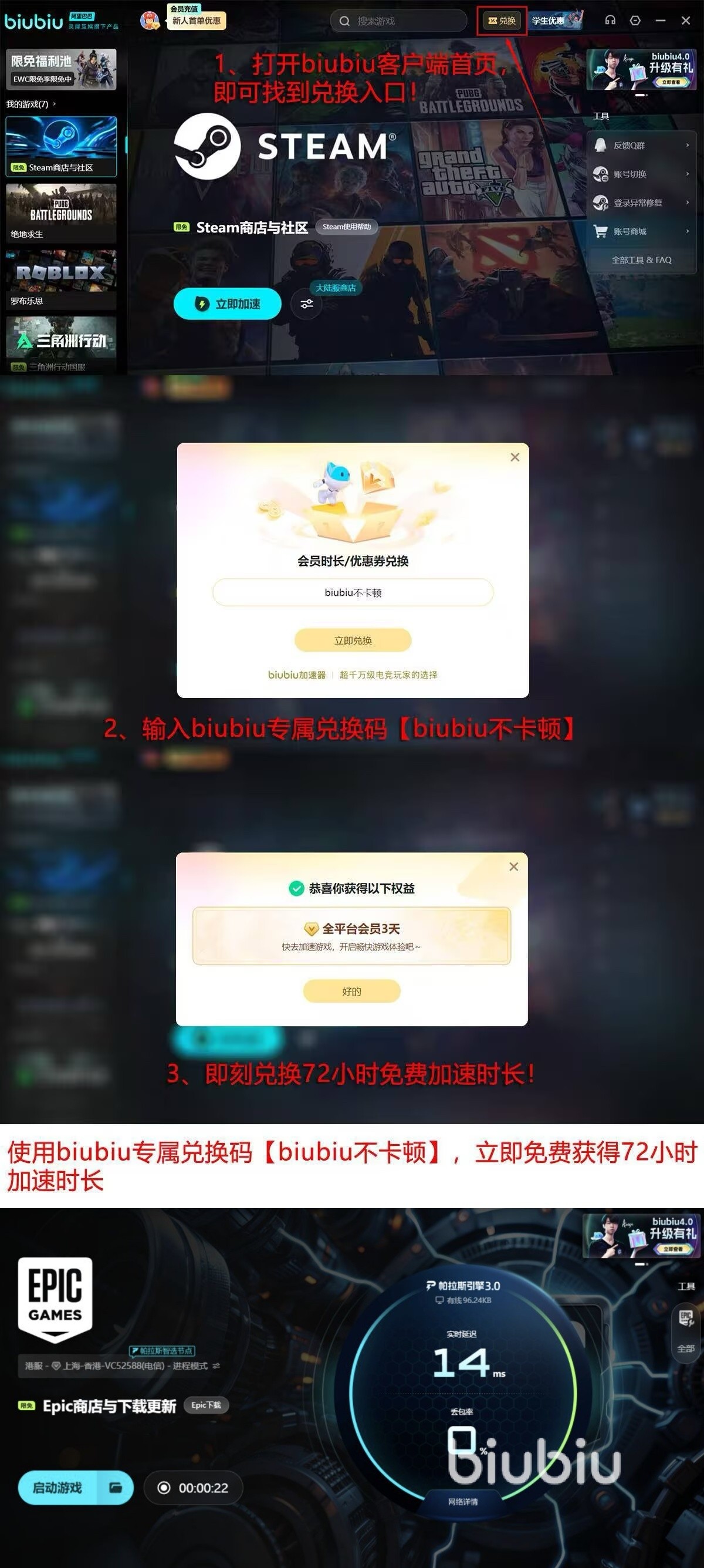 面向首次接触网络加速服务的用户,biubiu提供零门槛体验机制:完成基础账号注册后,即可立即激活24小时全功能免费试用权限,覆盖Epic客户端全链路加速需求。所有活跃用户还可凭口令【biubiu不卡顿】领取额外3天加速时长。两项权益叠加后,单次开通最高可享连续4天无中断稳定连接,大幅降低决策成本,便于充分评估其对闪退、加载失败、更新中断等典型故障的实际修复效果。