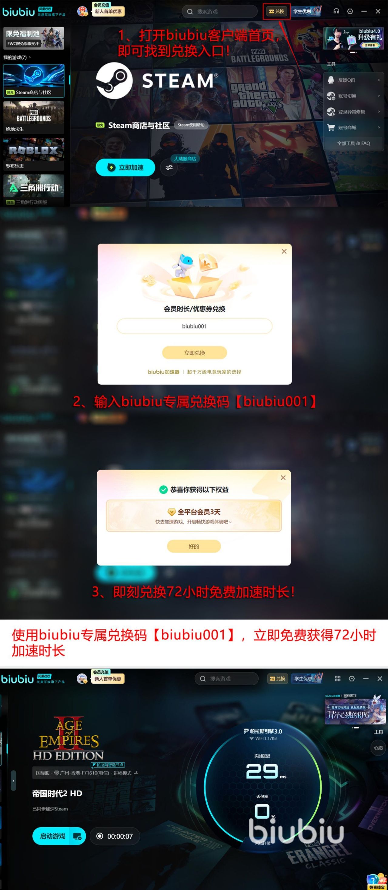 当前新用户注册即可自动获得24小时免费加速时长;另输入专属兑换码【biubiu001】,还可额外领取3天使用权。两项福利叠加,总计可享96小时无门槛加速服务,零成本应对联机卡顿与闪退困扰,助力玩家顺畅投入多文明对抗与史诗战役之中。
