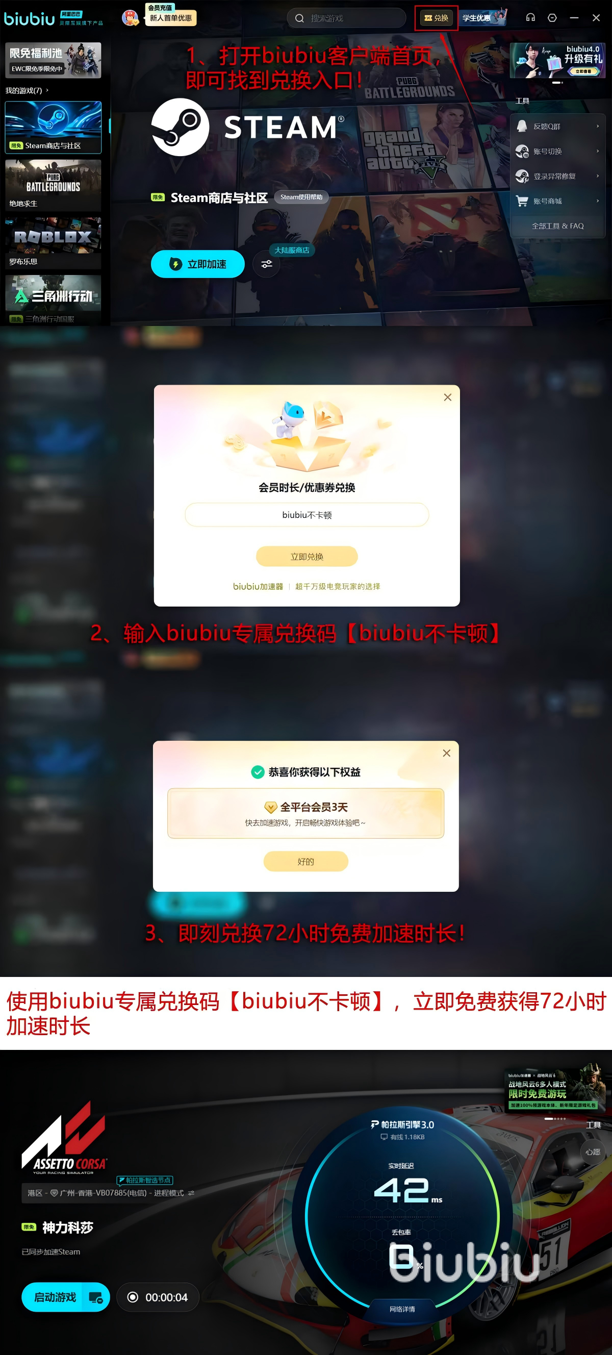 赶巧也是遇上了各种赠送优惠,等于大家能免费白用一段时间。抓紧注册账号,登录就拿新用户礼包,马上能享受24小时加速时间的。免费福利可不止有这些,首页能参与兑换活动,用【biubiu不卡顿】换来的就是额外的72h免费加速时长,这些能一起利用的,新用户持续享受高品质网络长达96小时。
