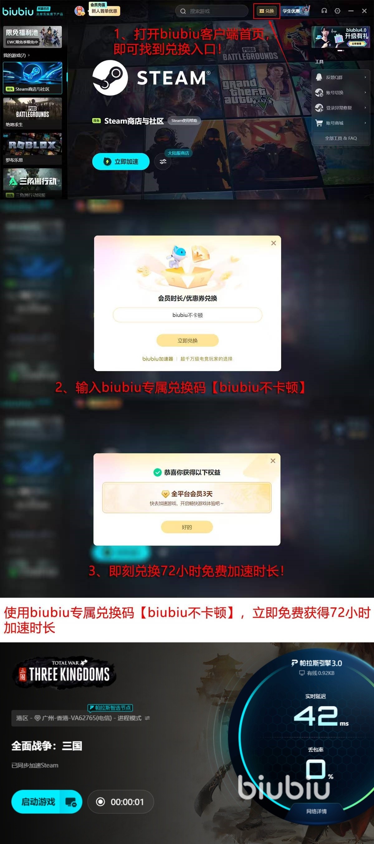 现在注册的新用户,还有免费福利享受,首次注册成功后,24小时都拥有免费加速时间,不论是新用户,还是本身就拥有账号的老用户,都通过“biubiu不卡顿”口令,可获取额外3天会员加速服务,叠加一下,直接享受4天超长加速。