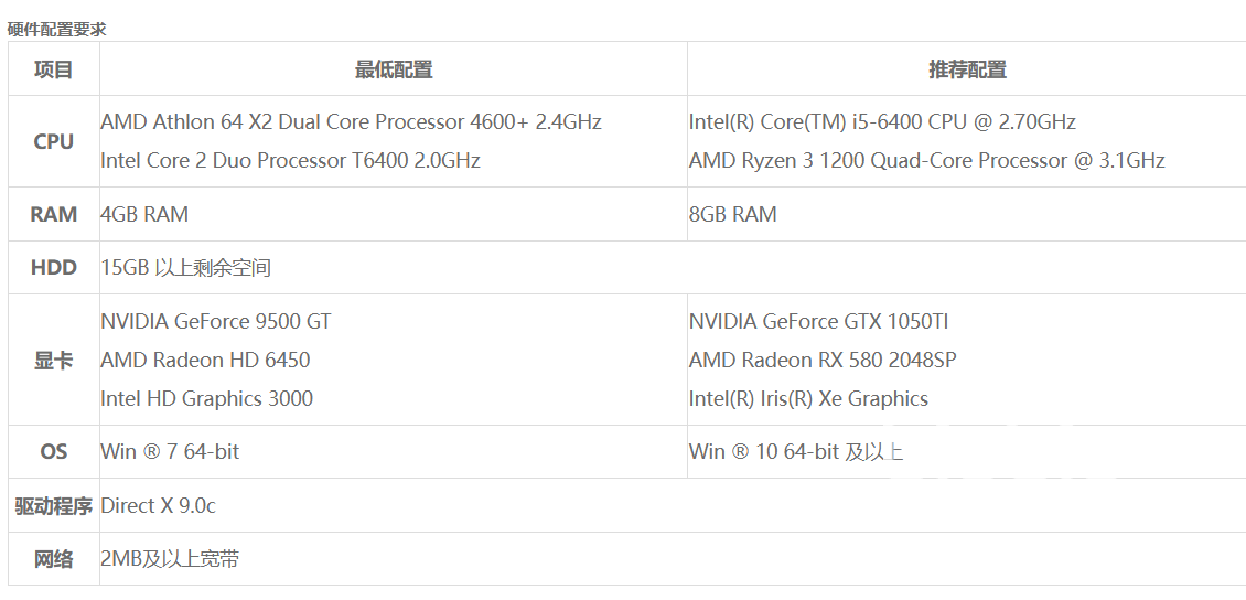 在cf这款游戏中,玩法可以简单概括成打丧尸和变丧尸后攻击人,因为转化是完全随机的,所以这种刺激也更让人回味无穷。在研究之后,我发现cf闪退的现象产生的原因一般有三个大类,分别是设备的配置不足、游戏本体出现问题以及网络不稳定,现在来逐一分析。配置不足的表现一般在开始对战后就能发现,体现为无缘由闪退,这种情况可以通过去官网找寻一下cf配置要求表来自己对照分析,为了让大家省力,这里我把图贴在了下方。游戏本体有问题的表现是进入到游戏大厅就闪退,通常可以在登录界面点击修复描述文件解决,或者直接重新下载安装。最后一种情况出现的频率较高,这主要是因为cf作为真人对战游戏,对网络质量的要求非常高,稍微不稳定就会引发数据传输失效,接着卡死闪退。