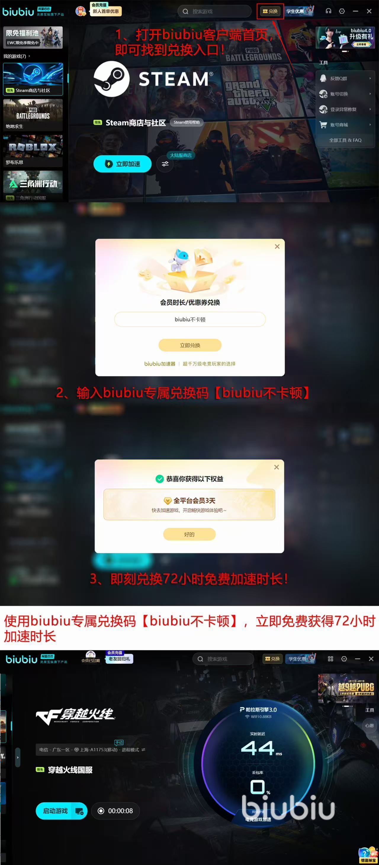 对了,现在正值biubiu的活动期间,朋友们经过简单的验证登录和实名就能获得24小时加速体验,同时在首页中输入兑换口令【biubiu不卡顿】还能领到为期3天的全平台全功能加速,除了cf之外,还有海量火爆作品在等待同学们前去游玩。