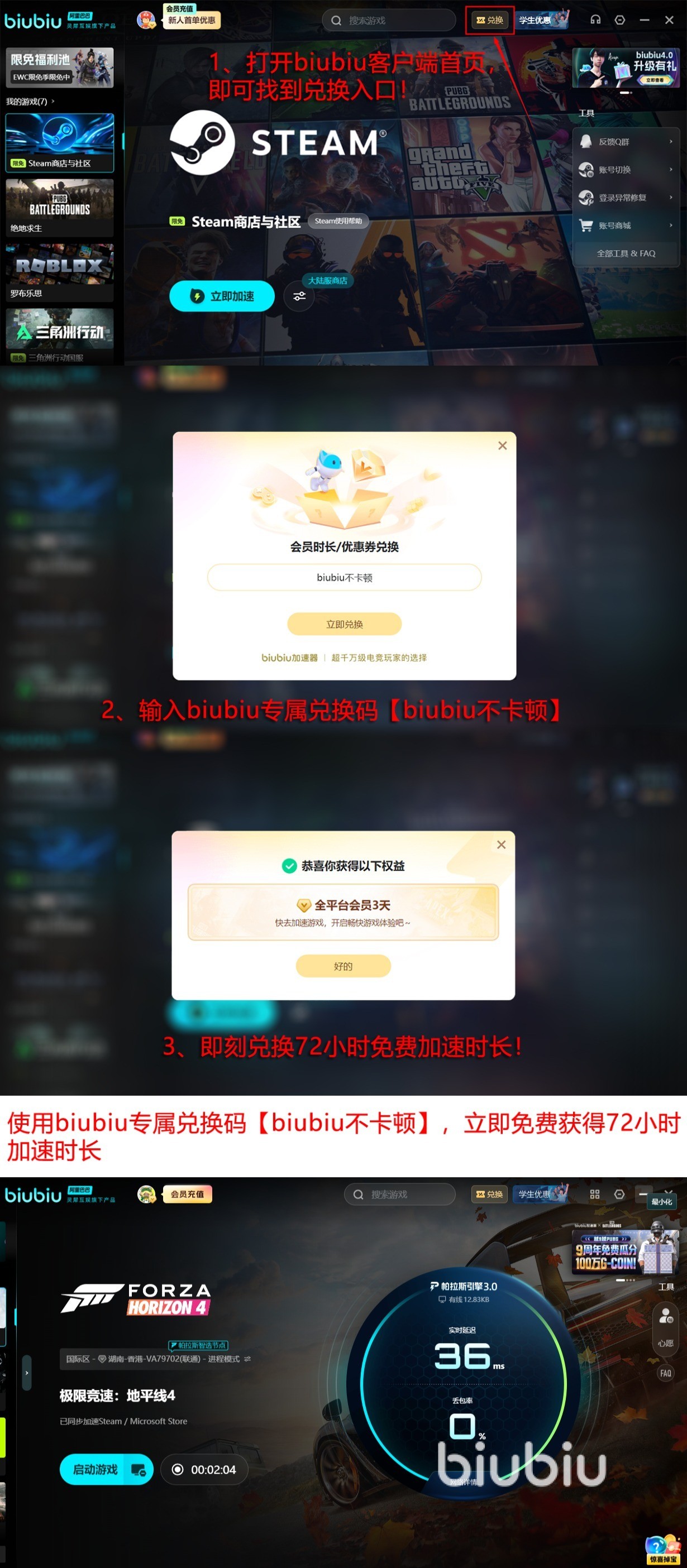 除了专业的技术能力之外,biubiu的活动力度也非常大气。在客户端兑换入口输入【biubiu不卡顿】即可享受整整3天的免费加速服务,新老用户都可参加。如果是新用户则不用着急使用这个兑换口令,因为新注册就会赠送24小时,这个工作日使用就挺好,兑换码留着周末用想想就很香。周六周日正是用网高峰期,这时候才最能体现出biubiu加速器的实力,相信体验过电竞级线路在周末的强劲表现,你也会对biubiu赞赏有加的。