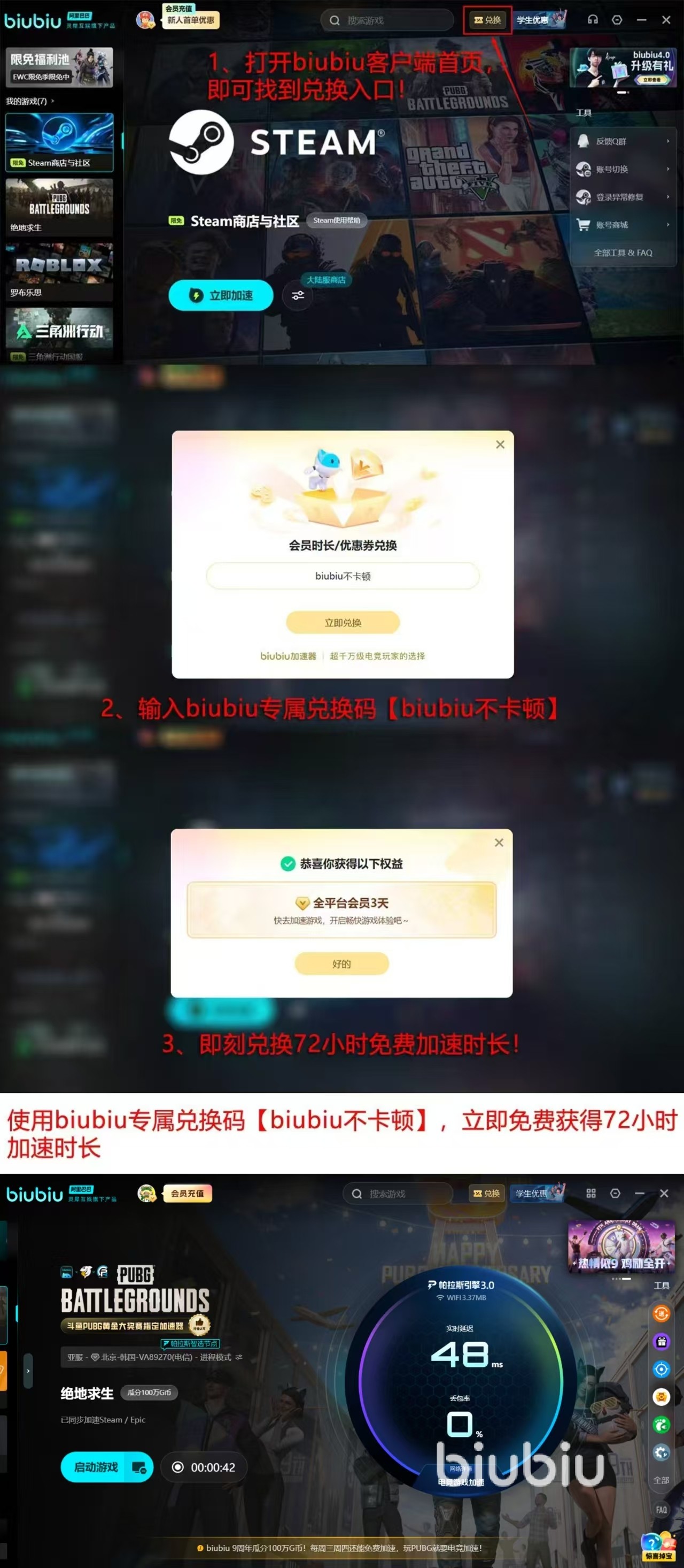 现在使用biubiu加速器的友友还能享受多重利好,新用户首次注册登录使用24小时免费加速,输入兑换码【biubiu不卡顿】再免费送72小时,当然老用户也能获得兑换码的福利。在平台验证过大学生的身份后,还可以拥有专属福利,首先价格上可最高立减100元,同时邀请好友上车可再获得15天会员。
