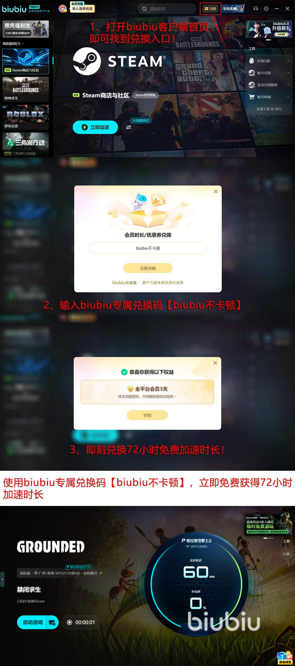 新用户注册biubiu加速器,立享24小时全功能免费试用,输入【biubiu不卡顿】更可额外领取72小时免费加速时长,两重福利叠加,总计畅享长达96小时的优质加速体验。