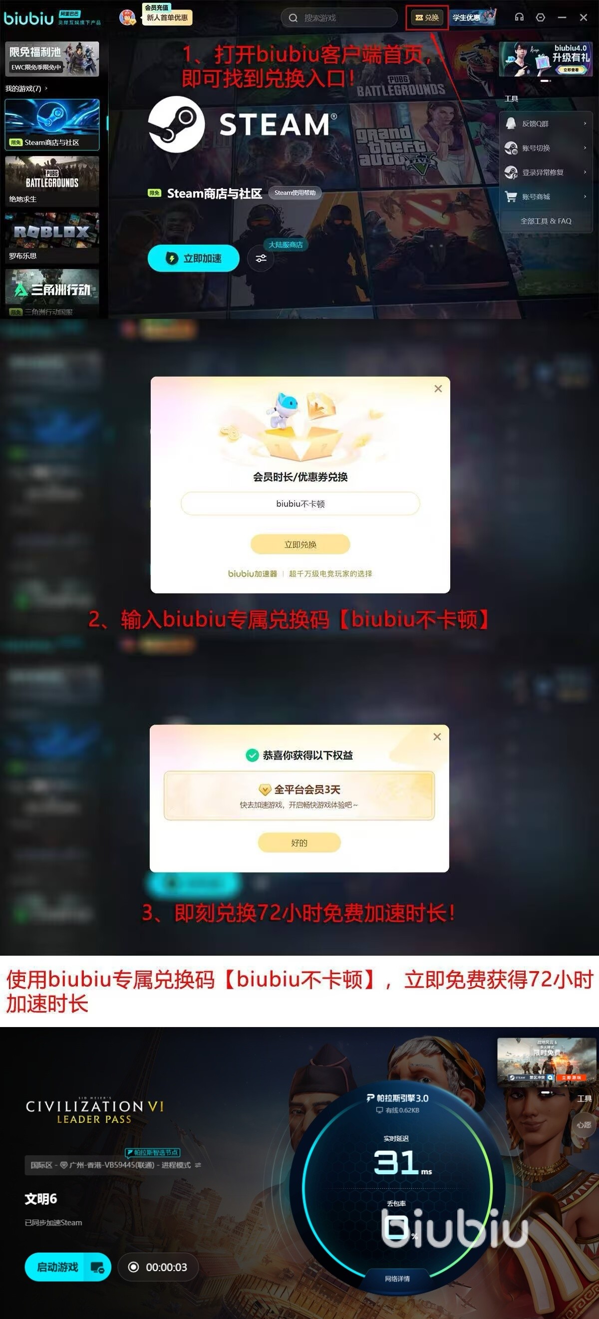 为了感谢大家的支持和信任,平台也为伙伴们准备了满满的福利。作为新手用户,在第一次完成注册登录之后,便能拿到平台赠送的24小时全天免费在线加速服务。另外平台的所有人员,不管新老用户都能够在兑换窗口通过输入【biubiu不卡顿】,额外解锁三天继续免费加速会员权限。biubiu社区还汇聚了众多大神攻略,如果在游戏中遇到策略难题,便可以前往寻求高手指点。