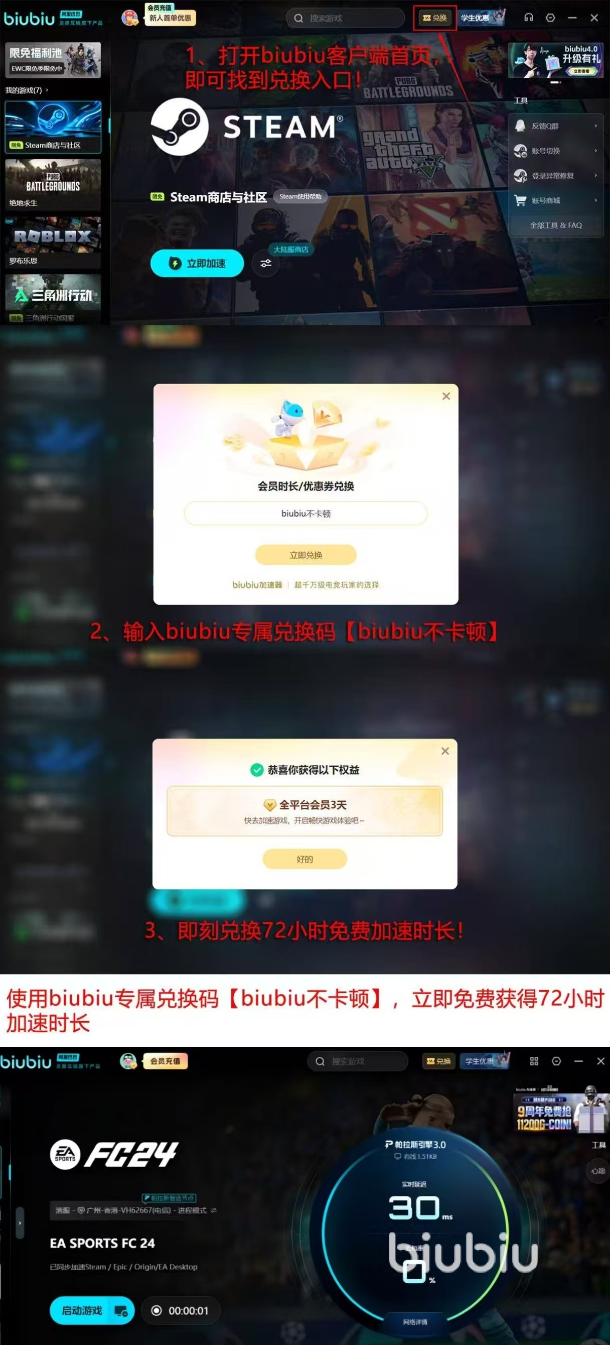注册biubiu加速器账号可以得到24小时试用期,输入兑换码【biubiu不卡顿】还可以再得72小时免费加速时间。这就意味着新用户可以得到96个小时的高速稳定网络服务,有足够的时间对游戏进行全方位的体验,亲身感受到游戏流畅度的明显改善。不管是生涯模式还是比赛,在遇到卡顿的时候都不会影响到你的发挥,让你可以随时进入比赛的状态中去。