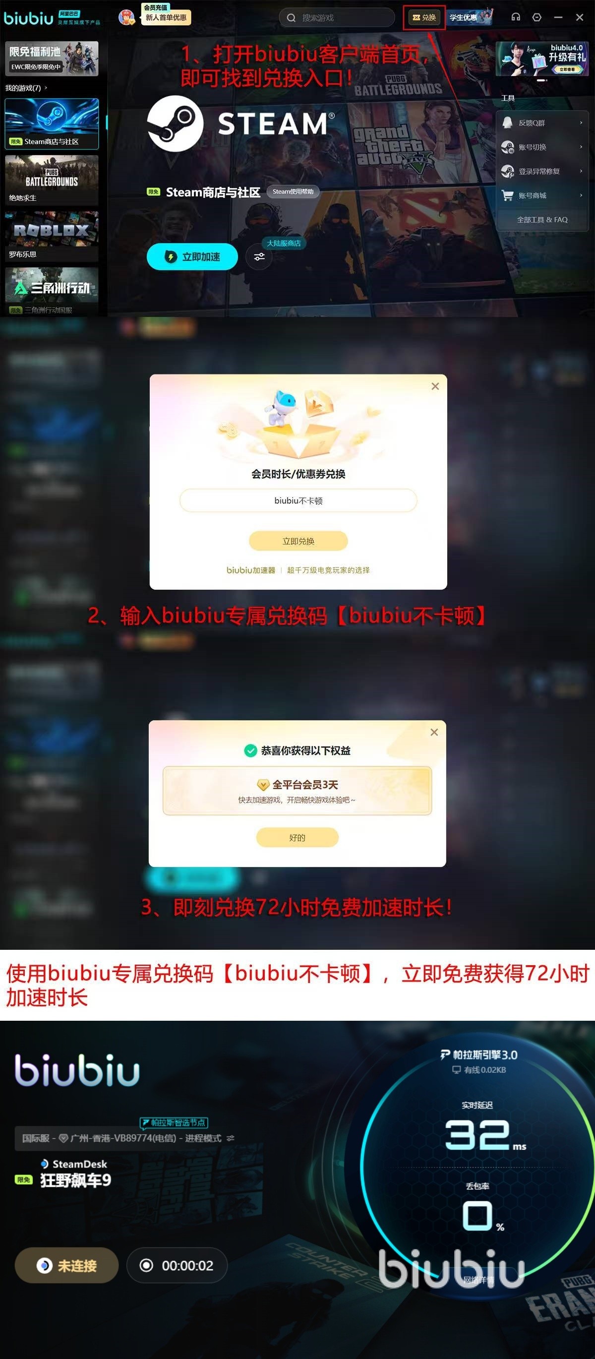 该加速器对于新用户有着很不错的福利。在新用户初次进入到加速器的时候可以获取到24小时免费加速时间。在输入口令兑换码【biubiu不卡顿】则还可以额外获取到72小时的免费加速时间。