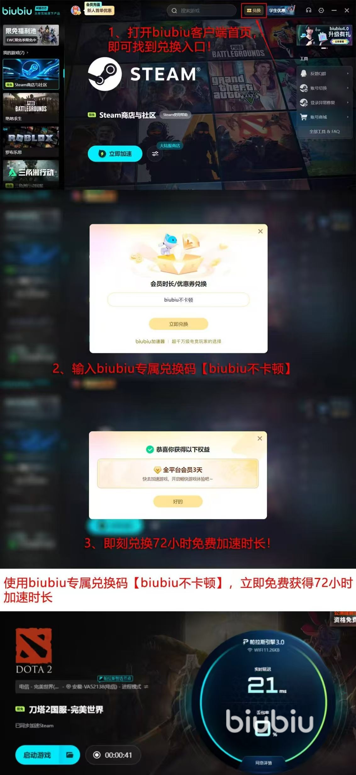 注册biubiu加速器账号之后,可以获得24小时的试用期,并且输入兑换码【biubiu不卡顿】之后还会再加72小时的免费加速时长。总计96小时的免费体验,给玩家足够的时间去体会网络优化的效果,在不同的地区、不同的网络环境下稳定性是否有所改变。无论新手还是老手,都可以在这样一个完备的体验系统里找到自己最合适的一种加速器,从而减小由于卡顿、延迟等所造成的不良影响。