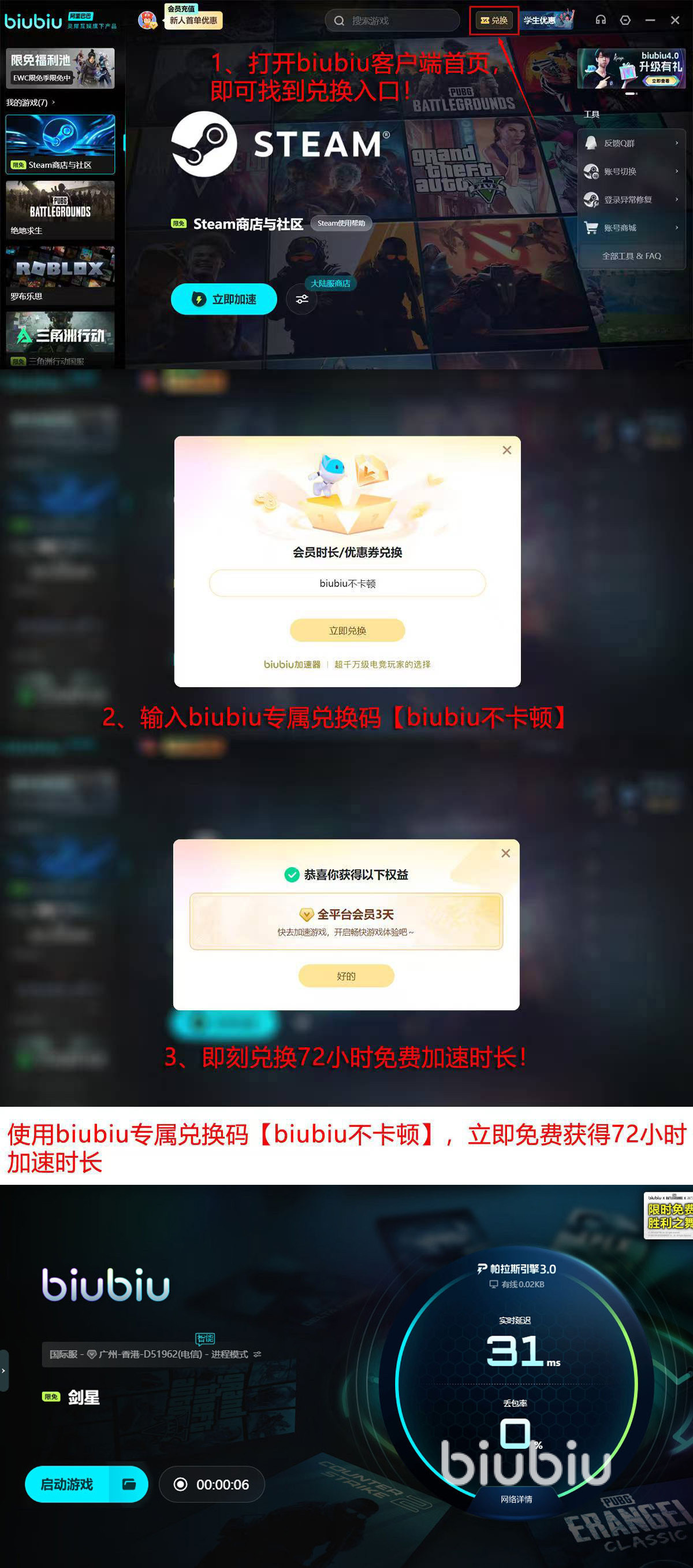 大家在玩剑星时,如果担心有闪退风险,想要游戏一直处于流畅状态,那现在可以先领取几天免费时间,先体验一番,现在可领取时间有两个,首先是注册新账号时系统送的24小时,另外一个是在首页上,打开了“兑换”窗口后,用【biubiu不卡顿】兑换口令后,可以拿到的72小时,总时间就有96小时了。